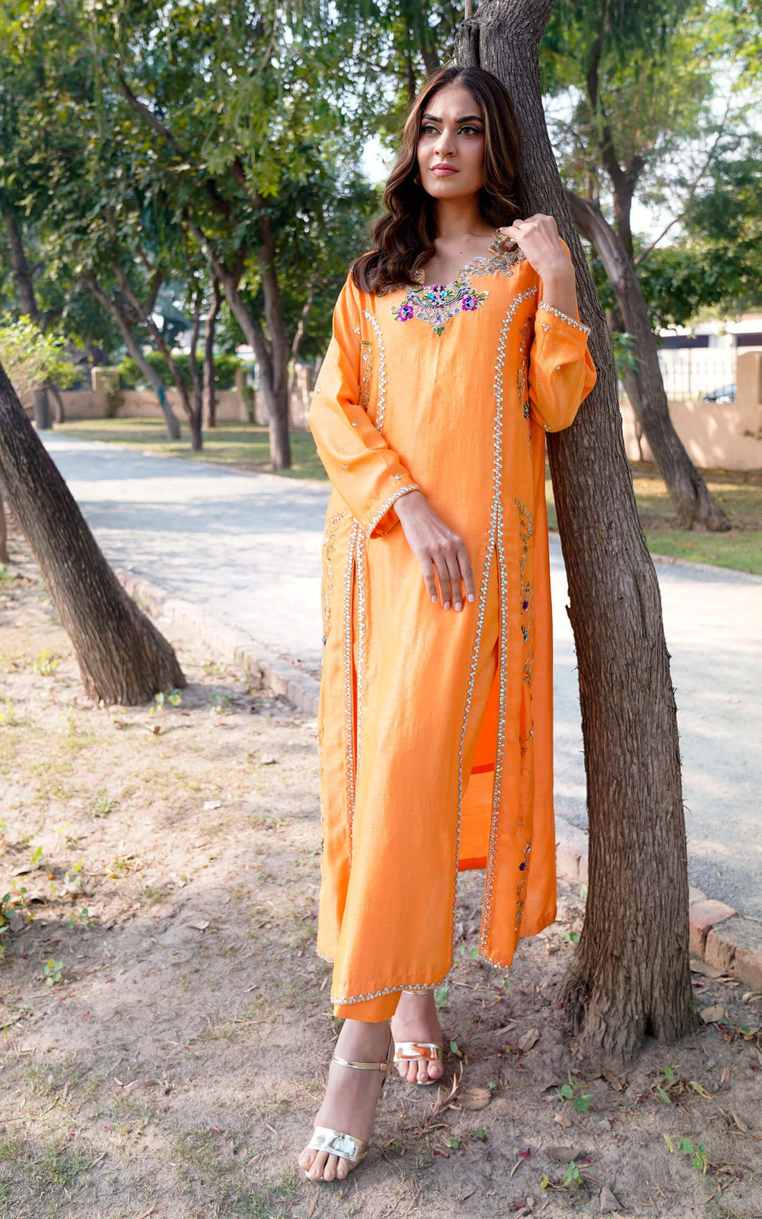 Color: OrangePrice Includes:Shirt & PantsDetails of Fabric:Shirt: SilkPants: SilkSize Customize: YesYou May Also Add: Dupatta (Net or Chiffon) Rs 1,500PKRColour...