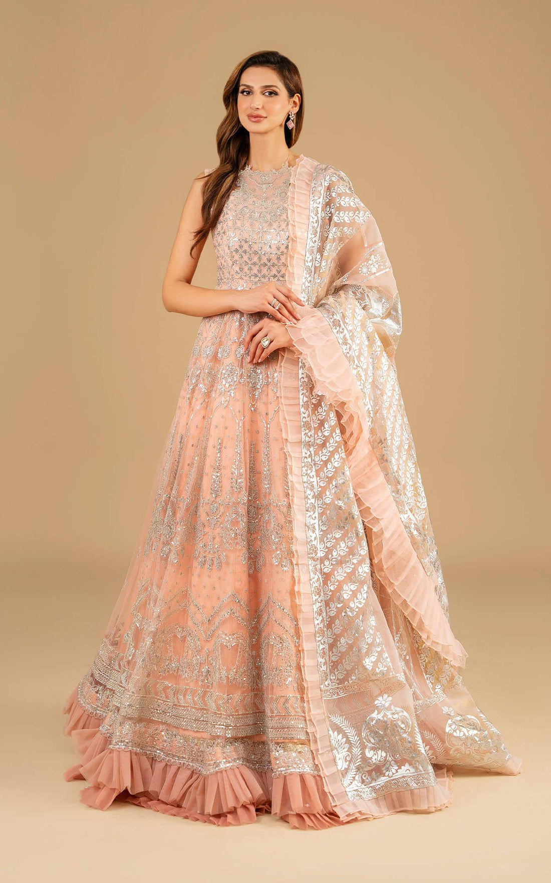 Price Includes:Shirt, Shawl & trouserDetails of Fabric: Embroidered sequined Front/Back body on dyed net. Embroidered...