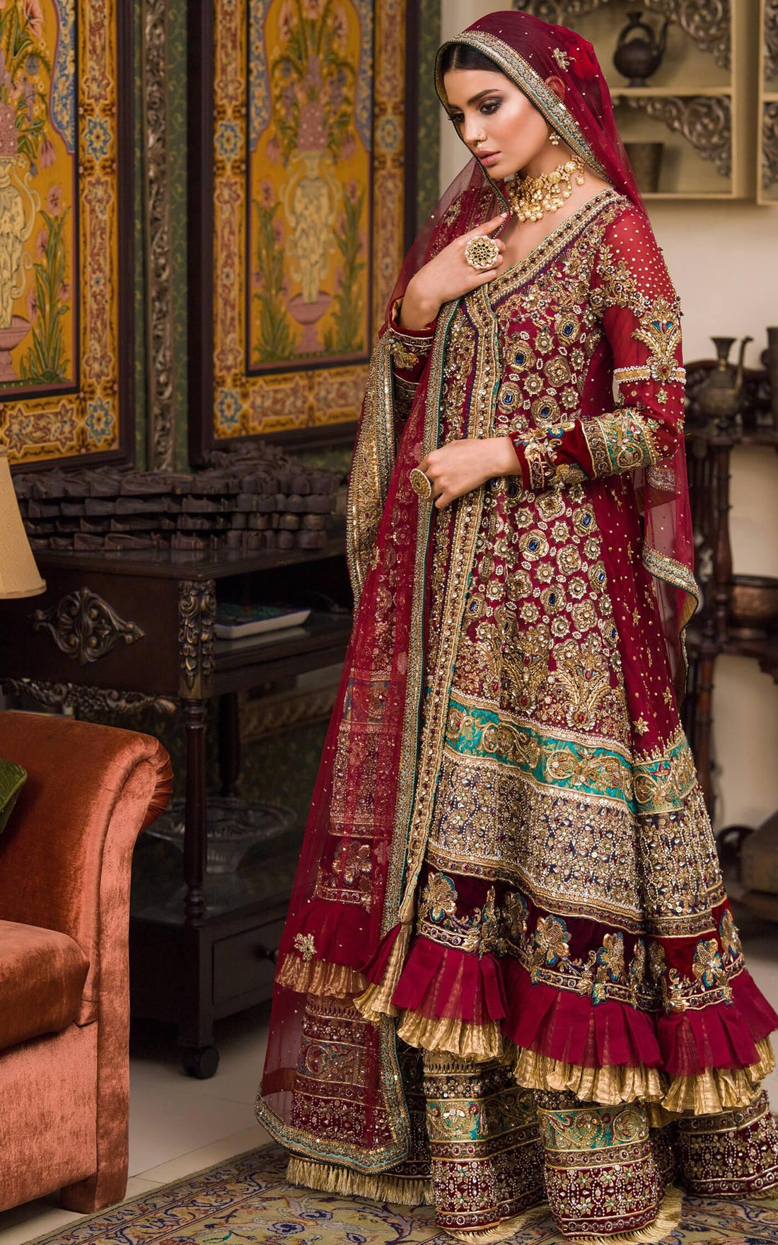The festivity of Pakistani weddings lasts for days, including qawali night, mayoon, mehndi, barat, and walima. Each event has its own cultural value, color scheme, and theme. Therefore, it is very important to find the perfect dress for each event. But no worries, because this collection offers a complete range of bridal attire according to these events. Playful and bright colored dresses with light embellishments and gota work are included for mehndi and mayoon functions. For the nikkah ceremony, this collection offers soft colors with minimal design to keep the whole look subtle and elegant. Similarly, reception dress for bride options are light colored gowns and lehengas with contemporary cuts and sparkly embellishments. While for barat day, this collection includes red and maroon dresses in multiple styles like lehnga choli, pishwas, and long farshi lehngas.