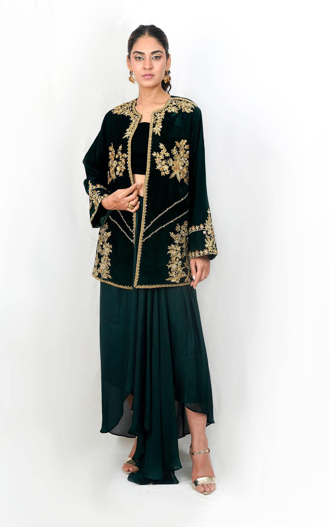 Color: Bottle GreenPrice Includes:Jacket, skirt & blouseDetails of Fabric:Jacket: VelvetSkirt: Cotton SilkBlouse: VelvetSize Customize: YesColour customize: YesYou May Also Add: Dupatta (Net...