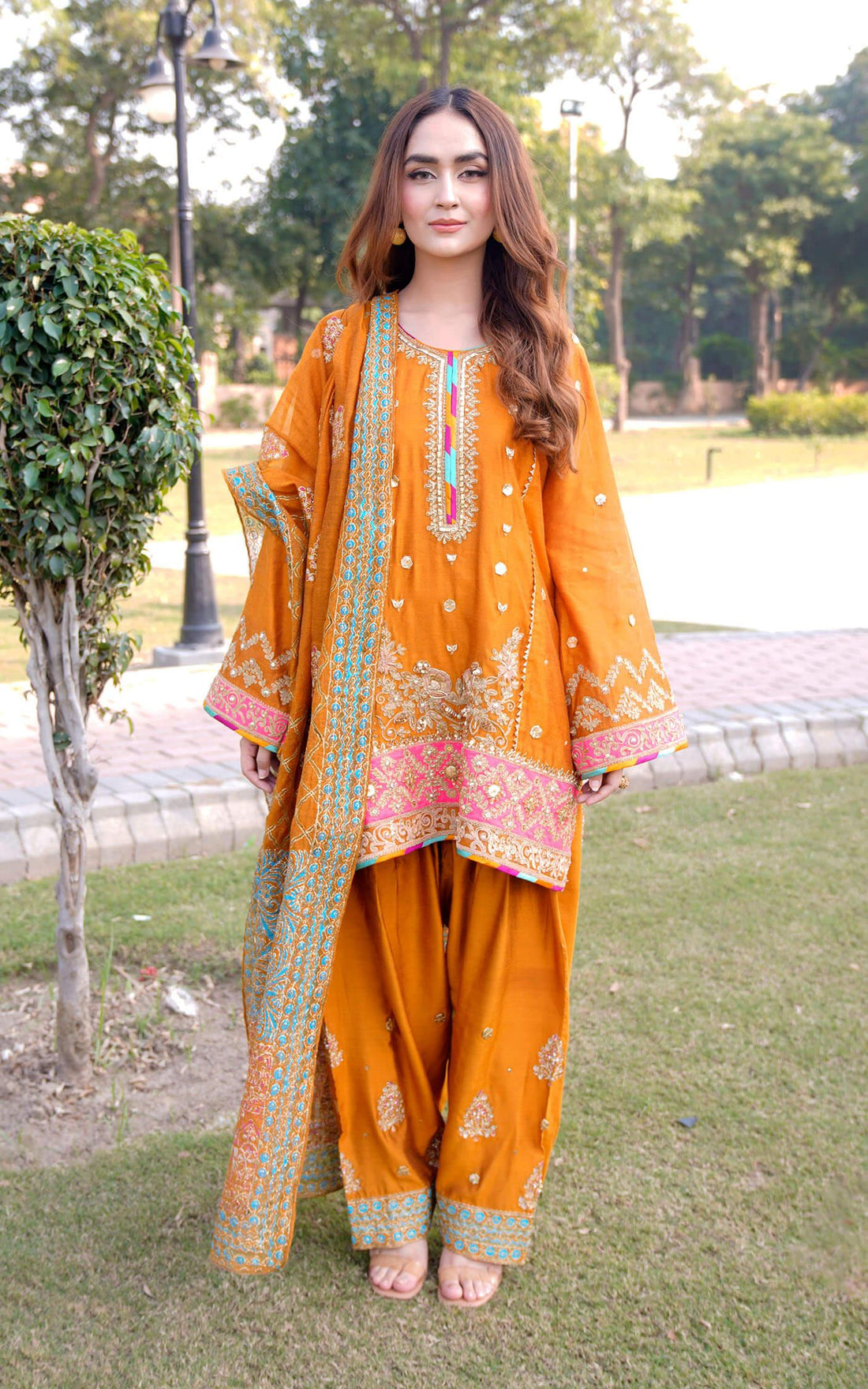 Color: Mustard YellowPrice Includes:Shirt, Shalwar & DupattaDetails of Fabric:Shirt: Cotton NetShalwar: SilkDupatta: Cotton NetSize Customize: YesYou May Also Add: Dupatta (Net...