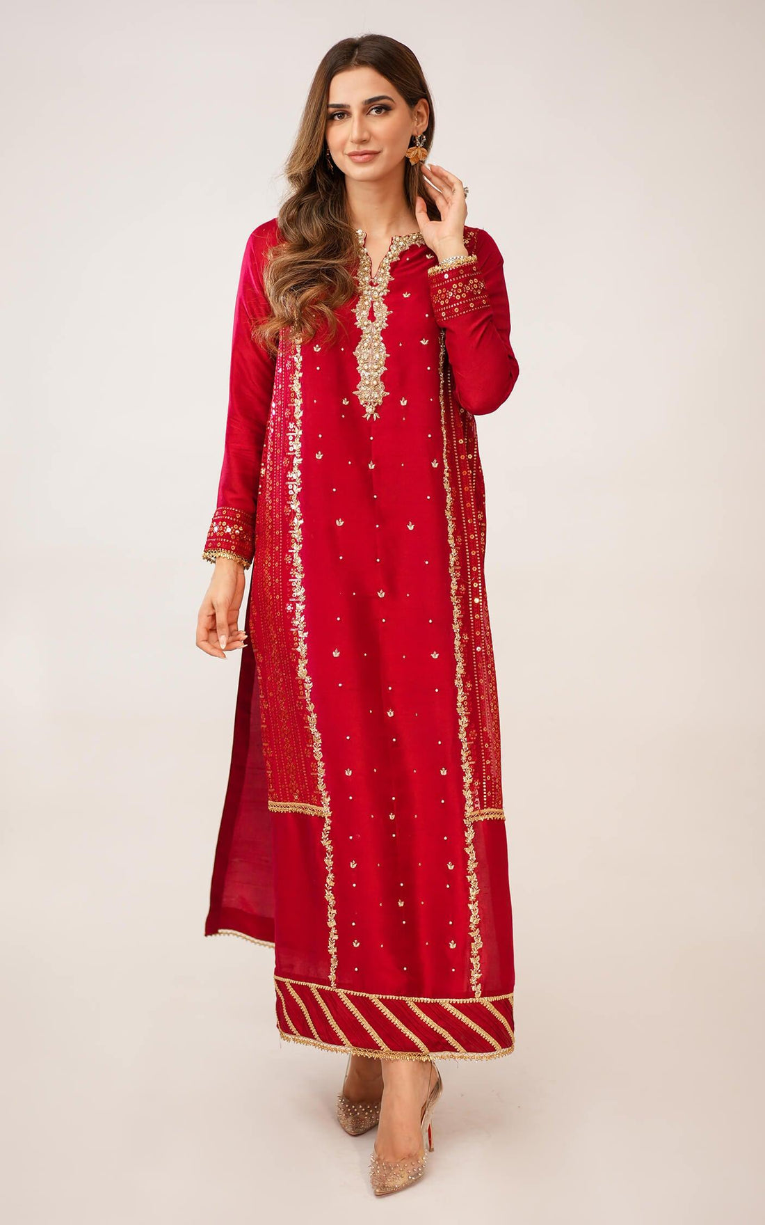 Red color. Luxury raw silk fabric for shirt & trouser. Beautifully embellished sequence & Mukaish...