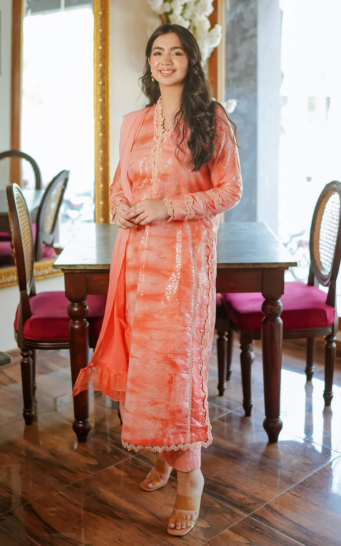 Color: Peachy Pink Price Includes:Shirt, trouser & Dupatta Details of Fabric: Shirt: Sequence on lawn Pants:...
