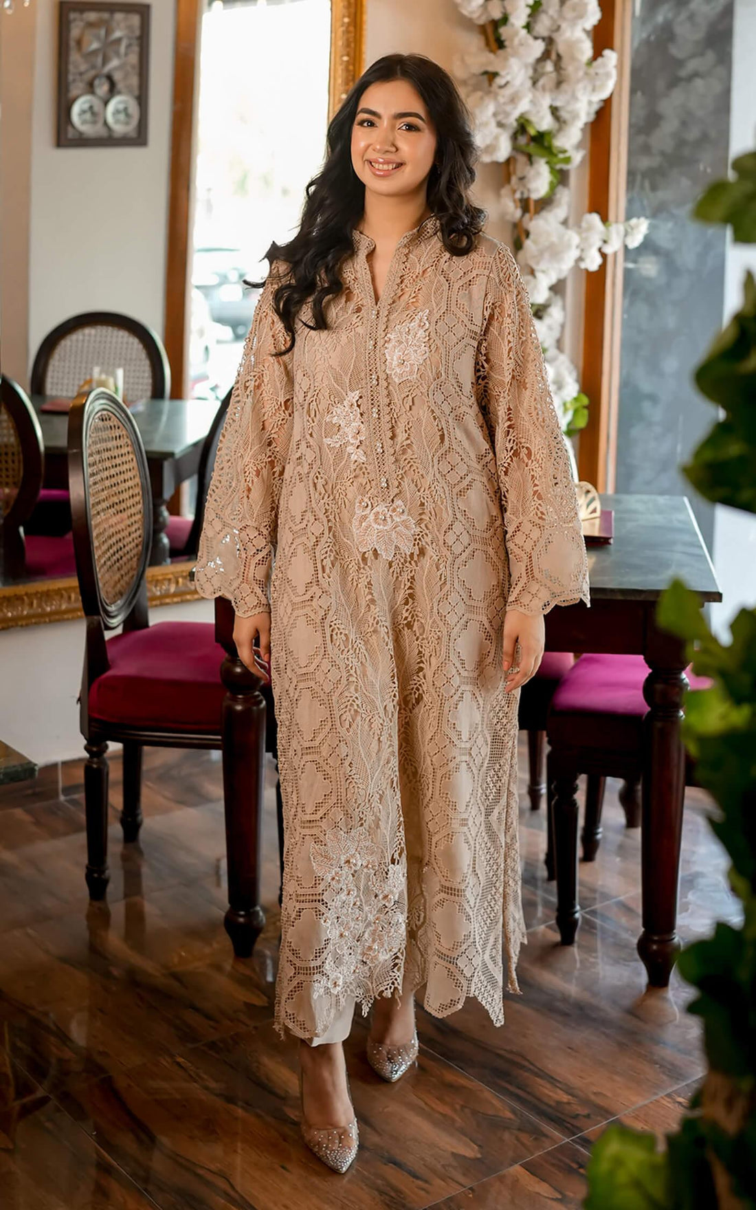 Color: Beige Price Includes:Shirt, Trouser & Slip Details of Fabric: Shirt: Net lace Pants: Korean Raw...