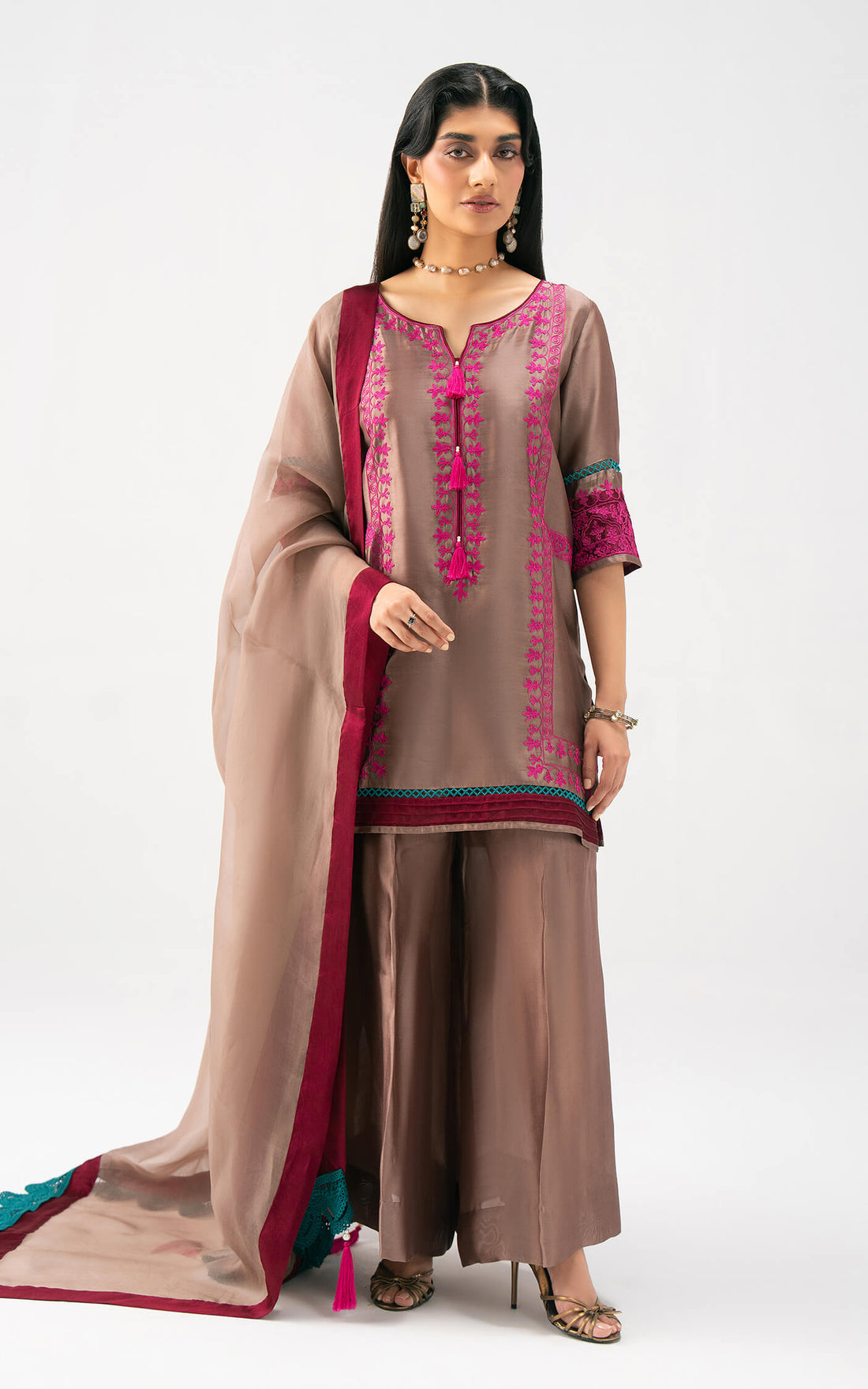 Fabric: Tissue SilkDupatta: Pure Organza Sophistication meets tradition in this brown Tissue Silk outfit, adorned...