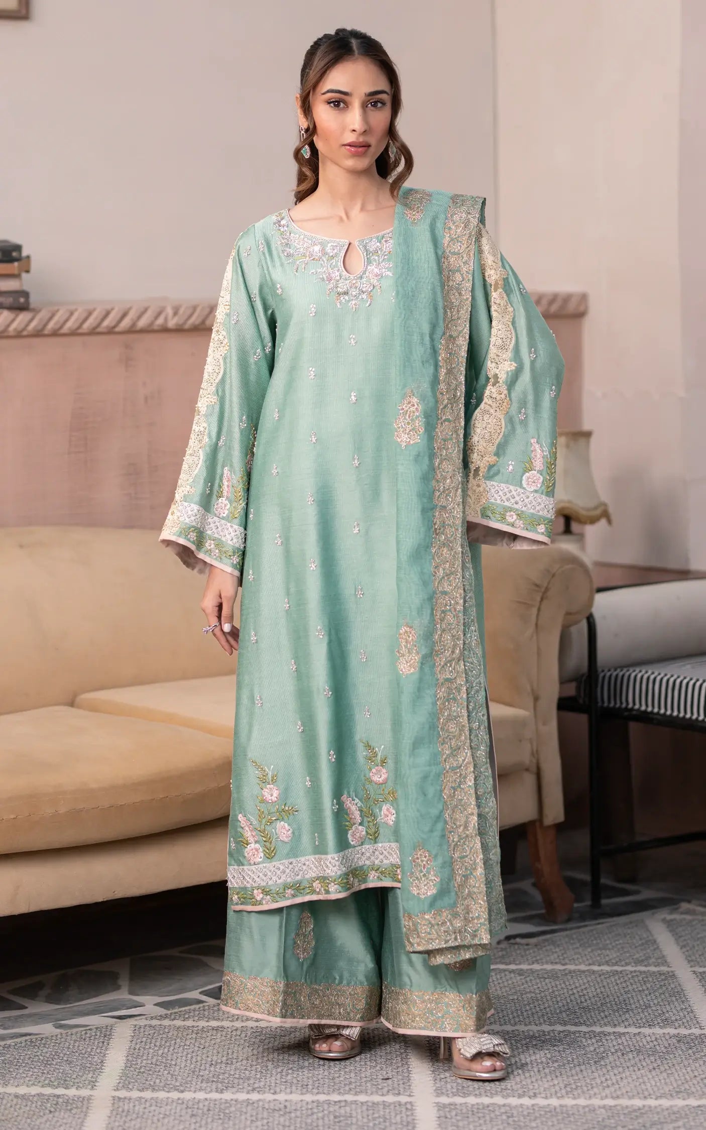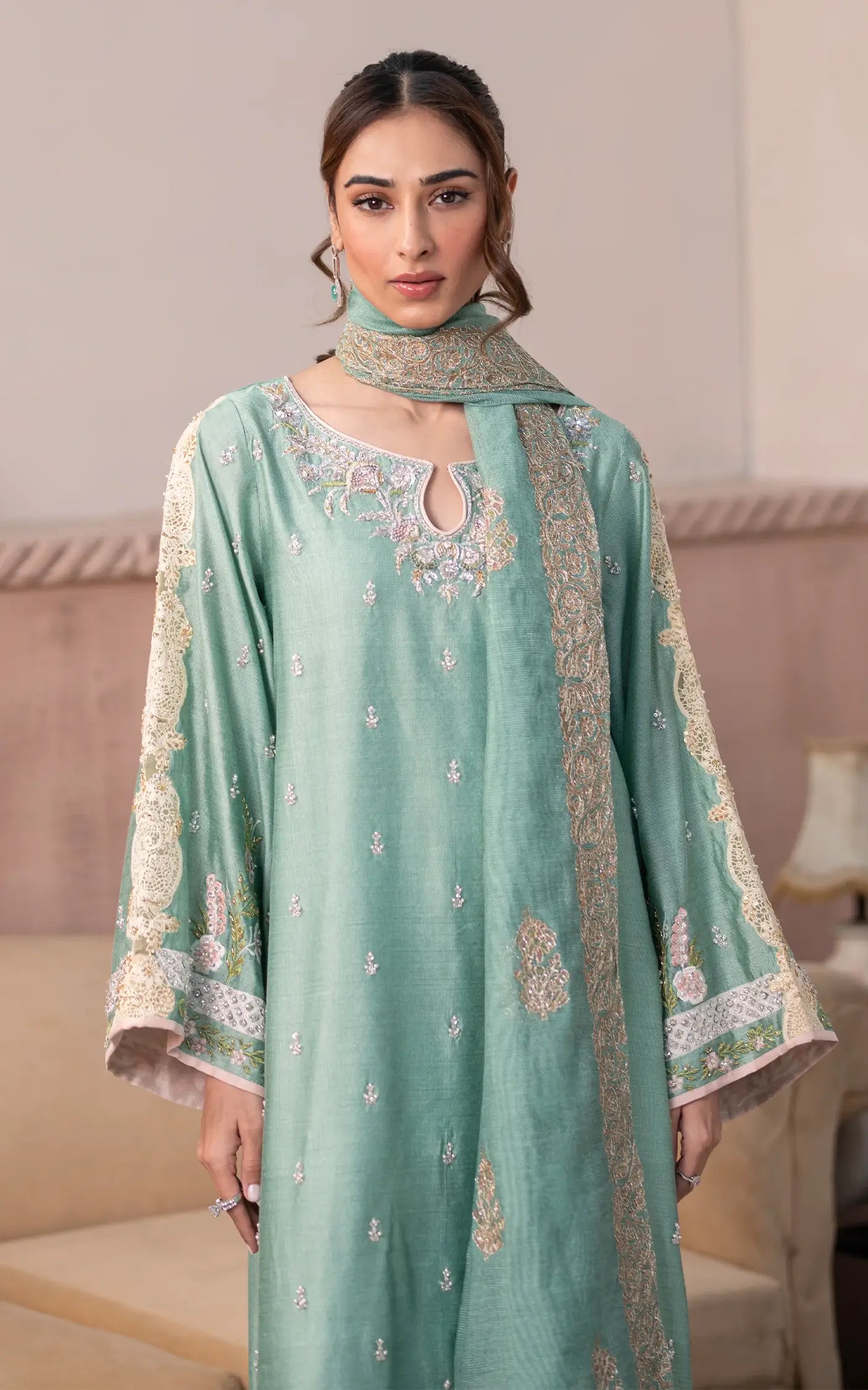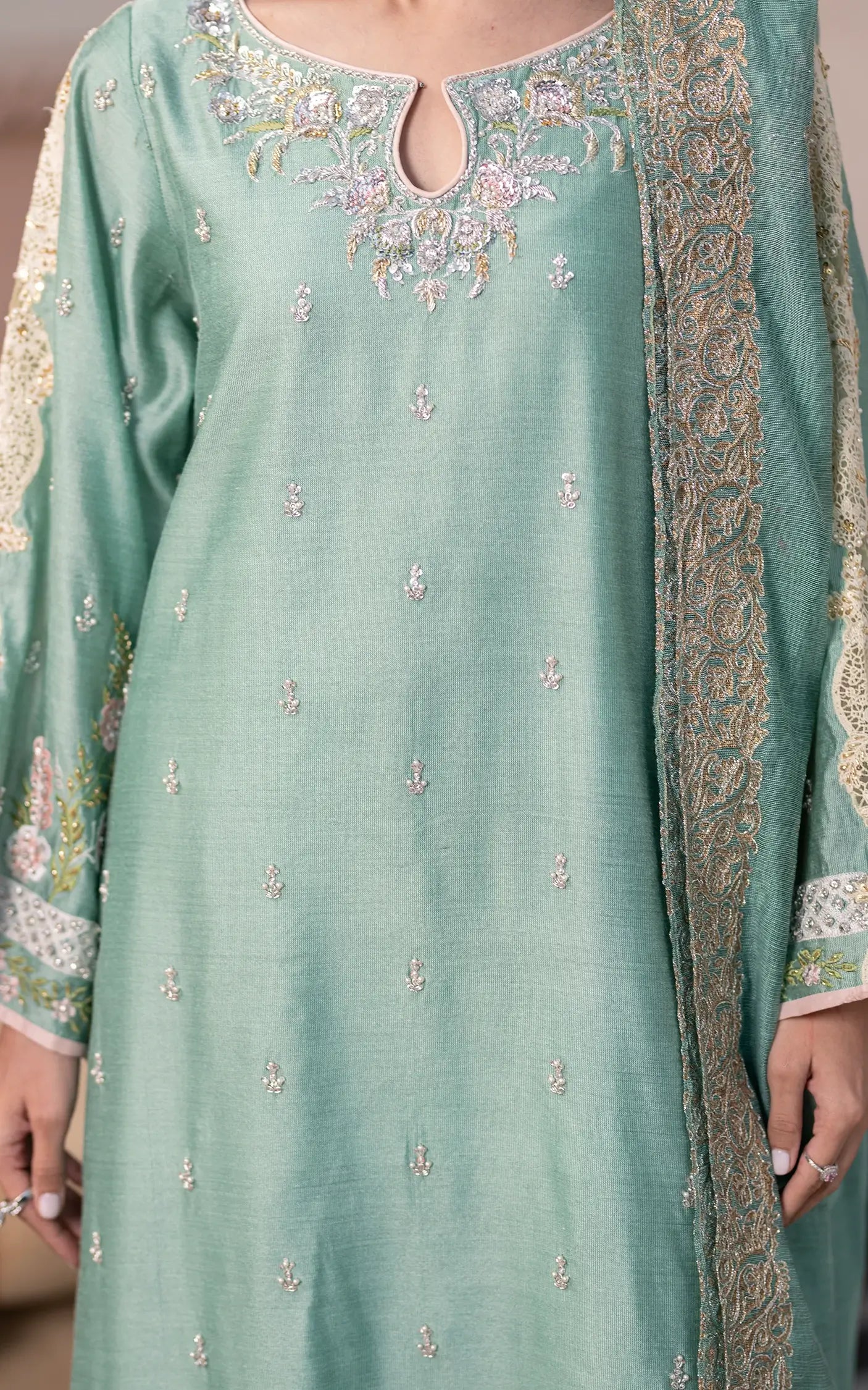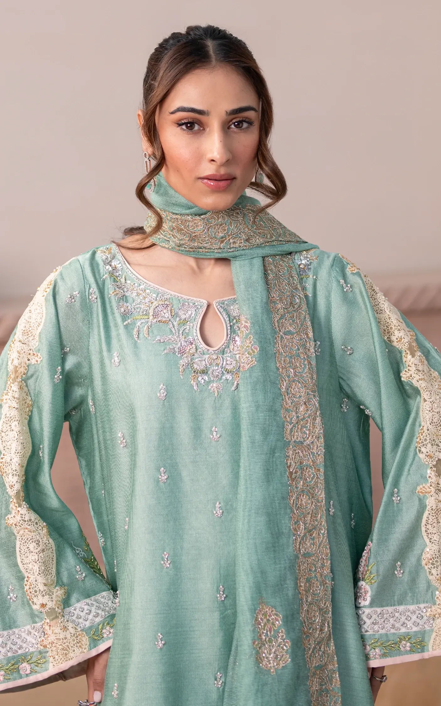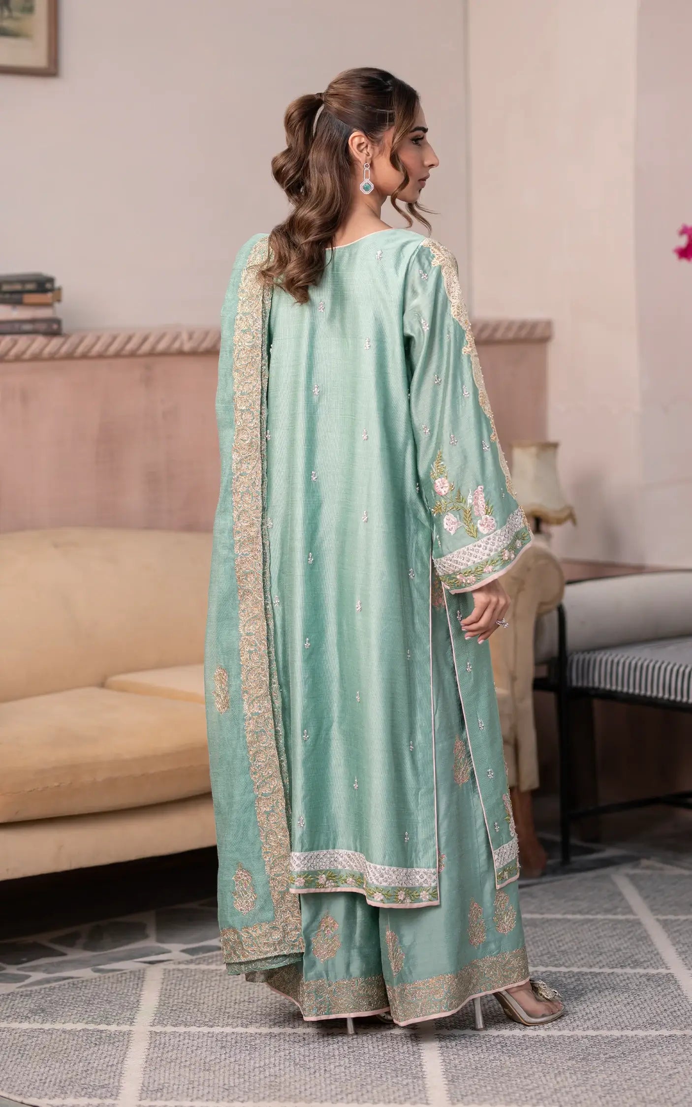 Aqua blue raw silk long shirt with neck, arm and border detail with cotton net dupatta with border with silver details and flared pants.
