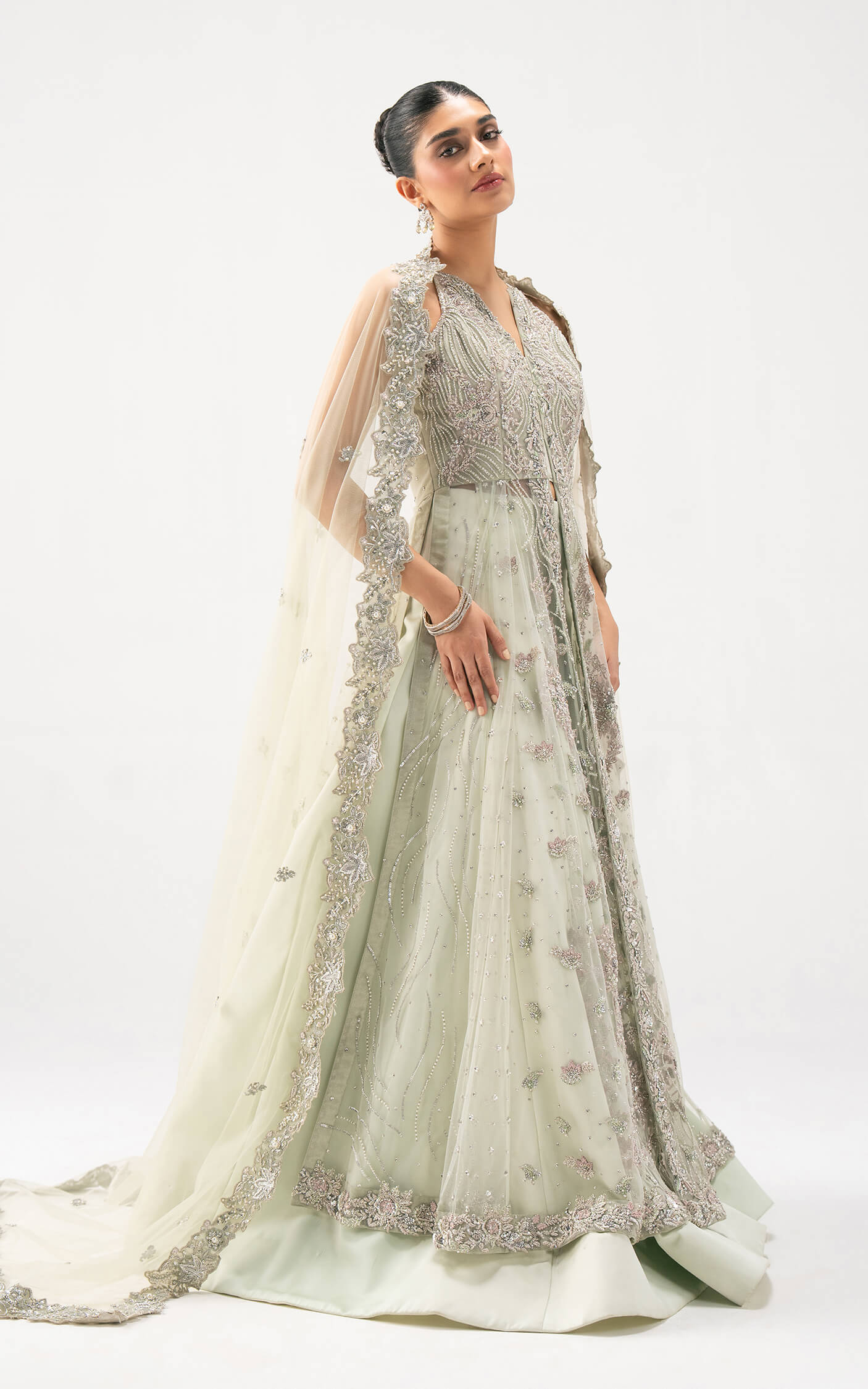 This Bridal ensemble is completed with a finely detailed dupatta, edged with ornate embroidery and crystal accents, adding a hint of ethereal charm. Its dreamy color palette and fluid design make it a statement choice for weddings, receptions, and festive soirées.
