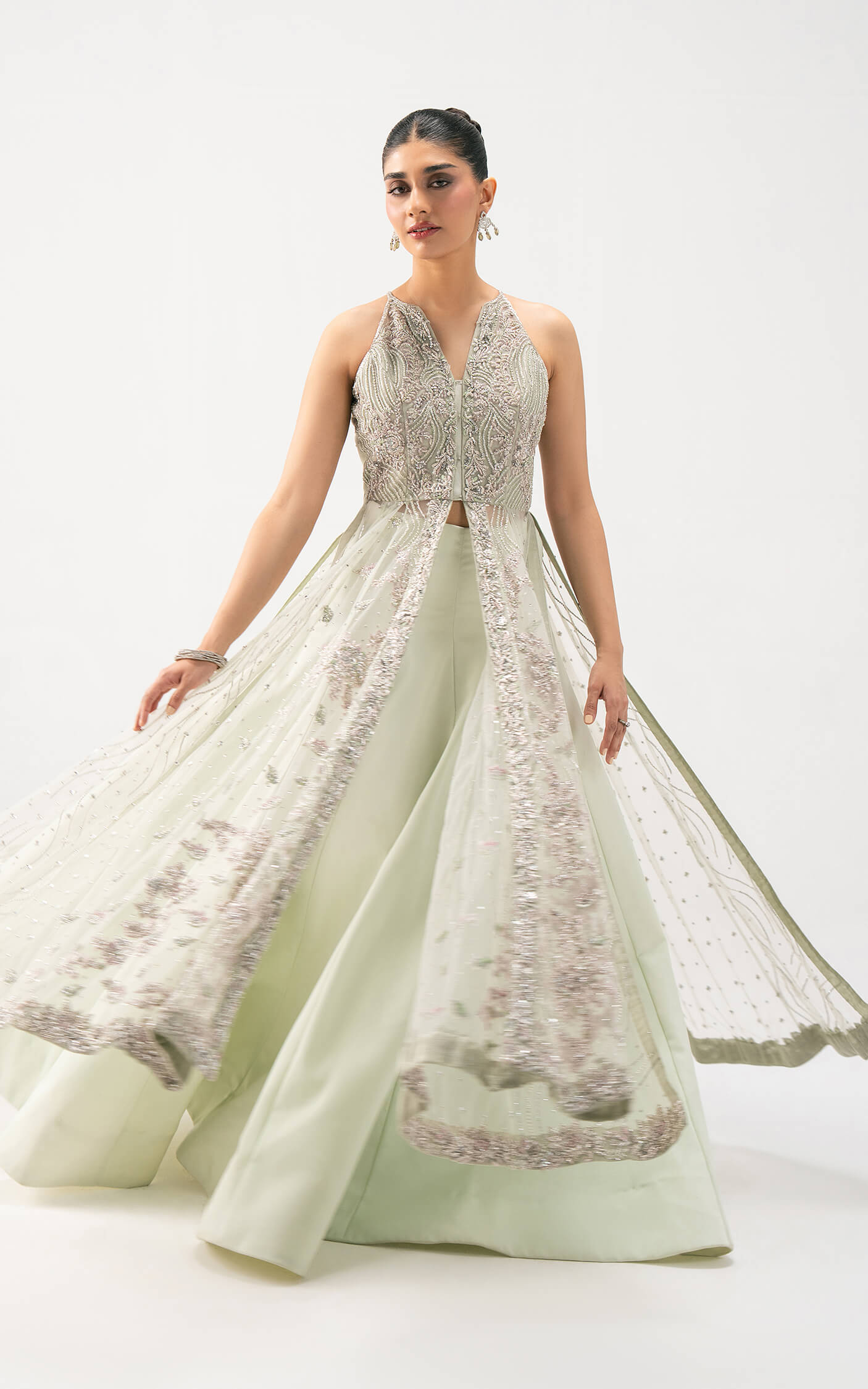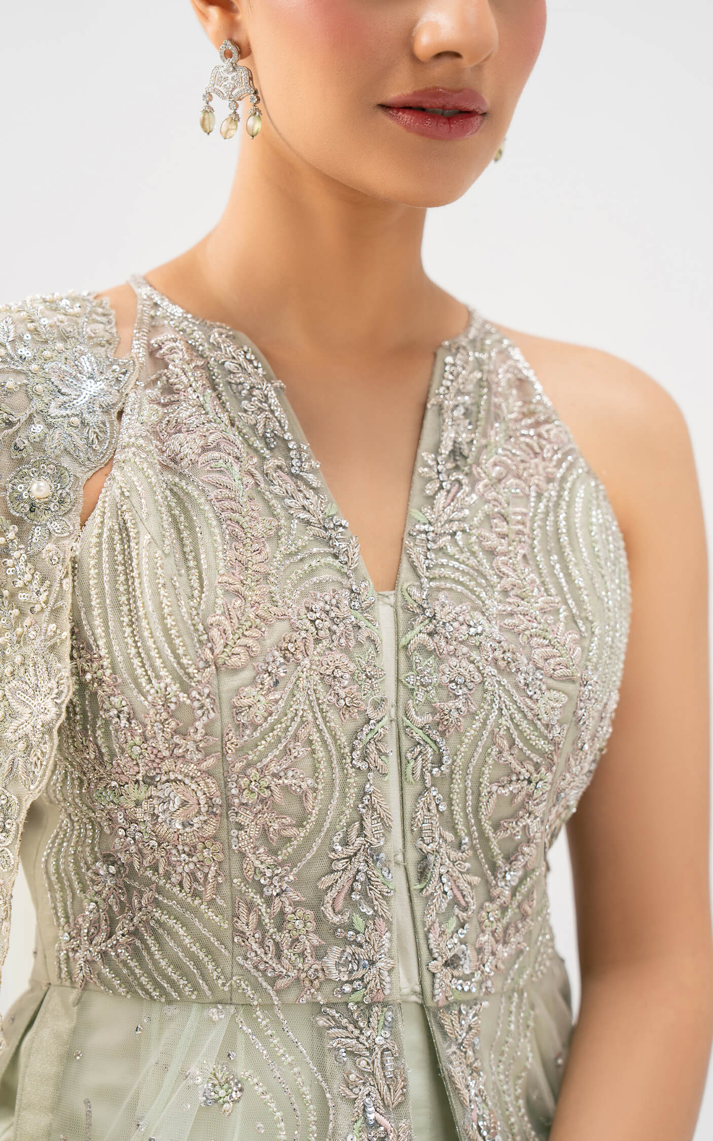 Celestial Aura is a Bridal vision of modern elegance wrapped in traditional artistry. This pastel-hued ensemble is crafted in a soothing mint-silver tone net fabric exuding sophistication and serenity. The sleeveless silhouette features an intricately embellished bodice with delicate handwork, sequins, and resham embroidery that cascade gracefully into flowing layers of sheer net and shamoz silk.