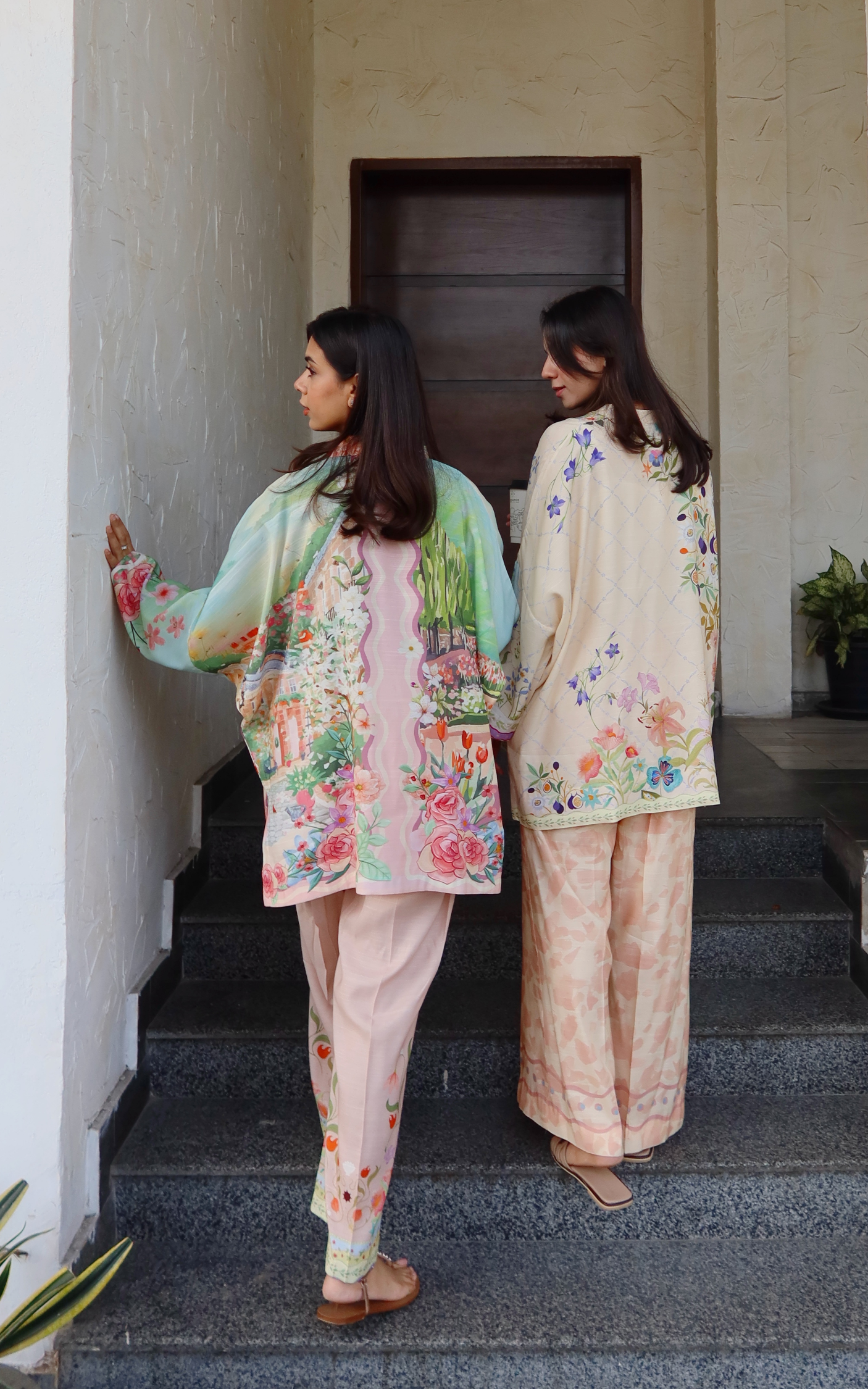 Embrace a fresh, garden-inspired aesthetic with this PK Raw Silk coord-set, showcasing an intricate botanical and floral print on a calm light-blue canvas. The shirt’s relaxed straight fit and straight-cut silhouette offer a modern, airy feel, complemented by matching straight-cut trousers. Delicate lace accents on the neckline and hem provide a feminine, high-end finish to this versatile ensemble.