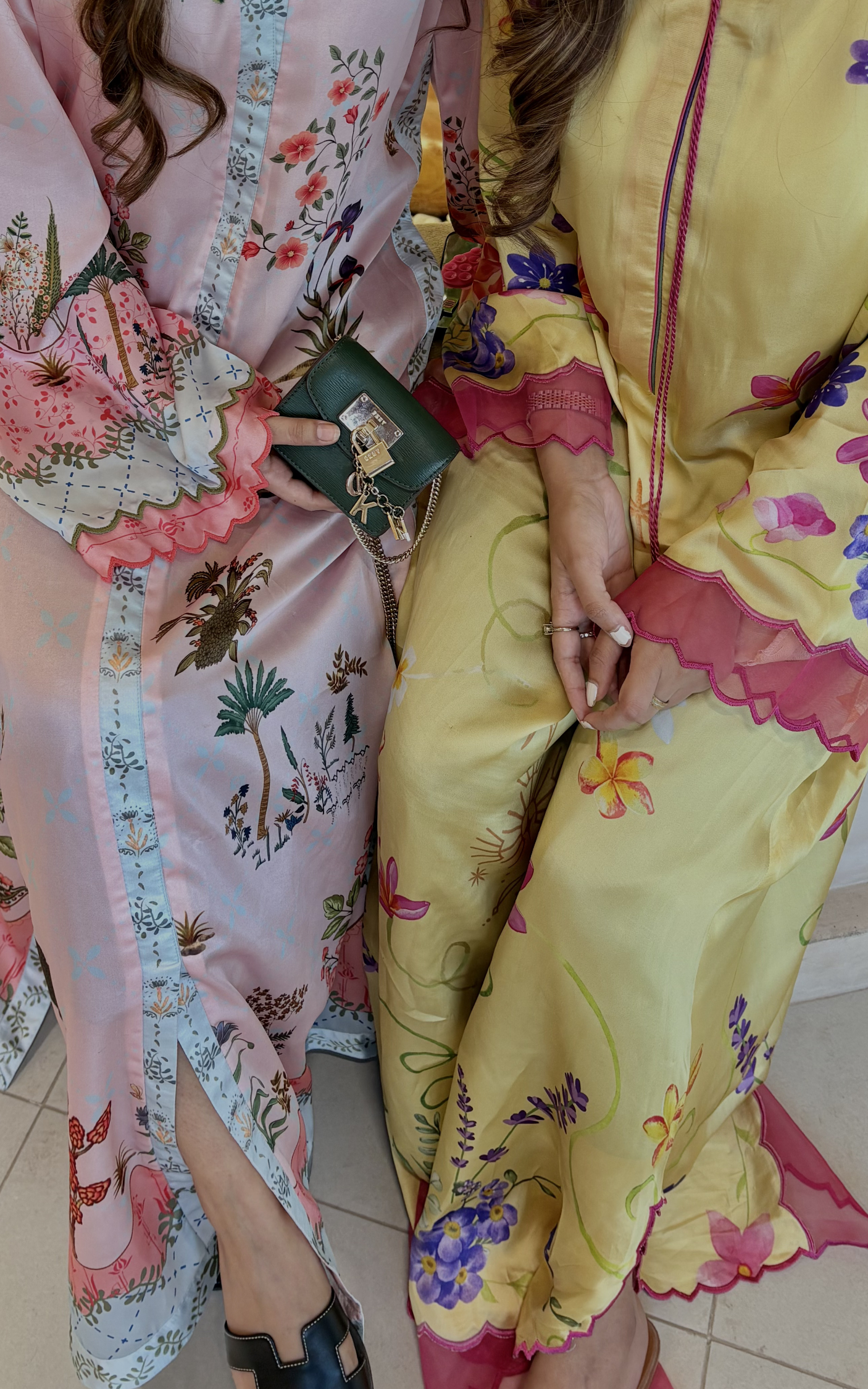 Elevate your evening wardrobe with this floor-length Kaftan, rendered in luxurious Shamooze Silk. Featuring a vibrant floral print with playful heart motifs and intricate floral borders, the design offers a perfect blend of whimsical art and high fashion. Its relaxed, flowy fit and straight silhouette create a fluid cut that drapes effortlessly, while wide flared sleeves and a delicate embroidered neckline add a touch of refined drama.