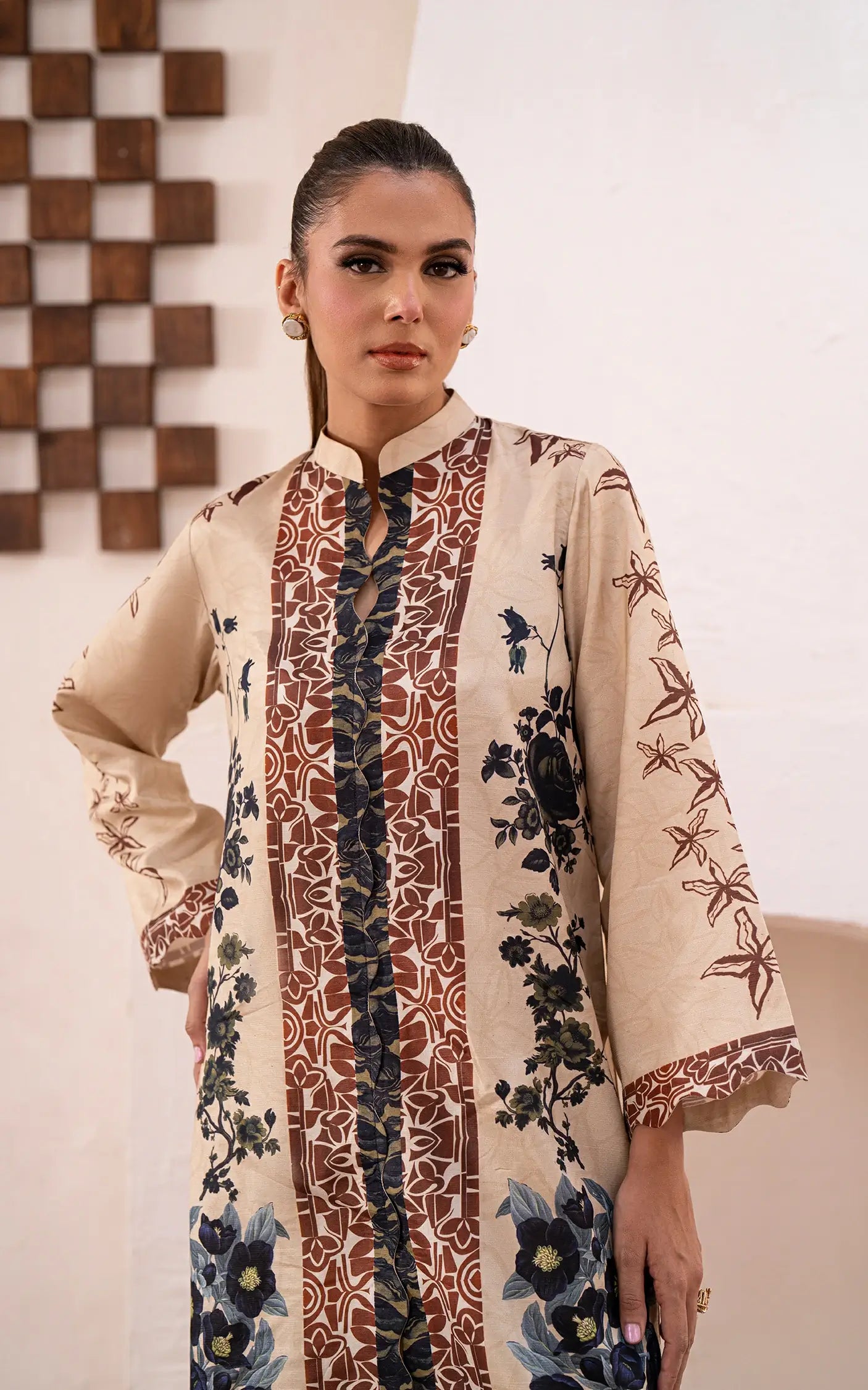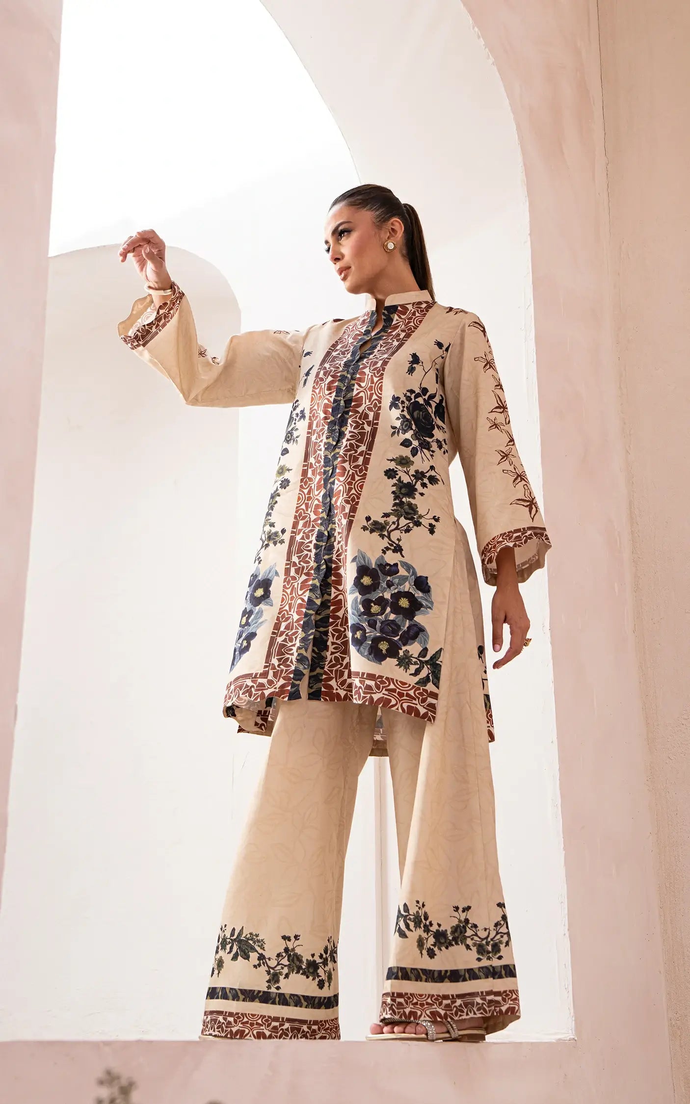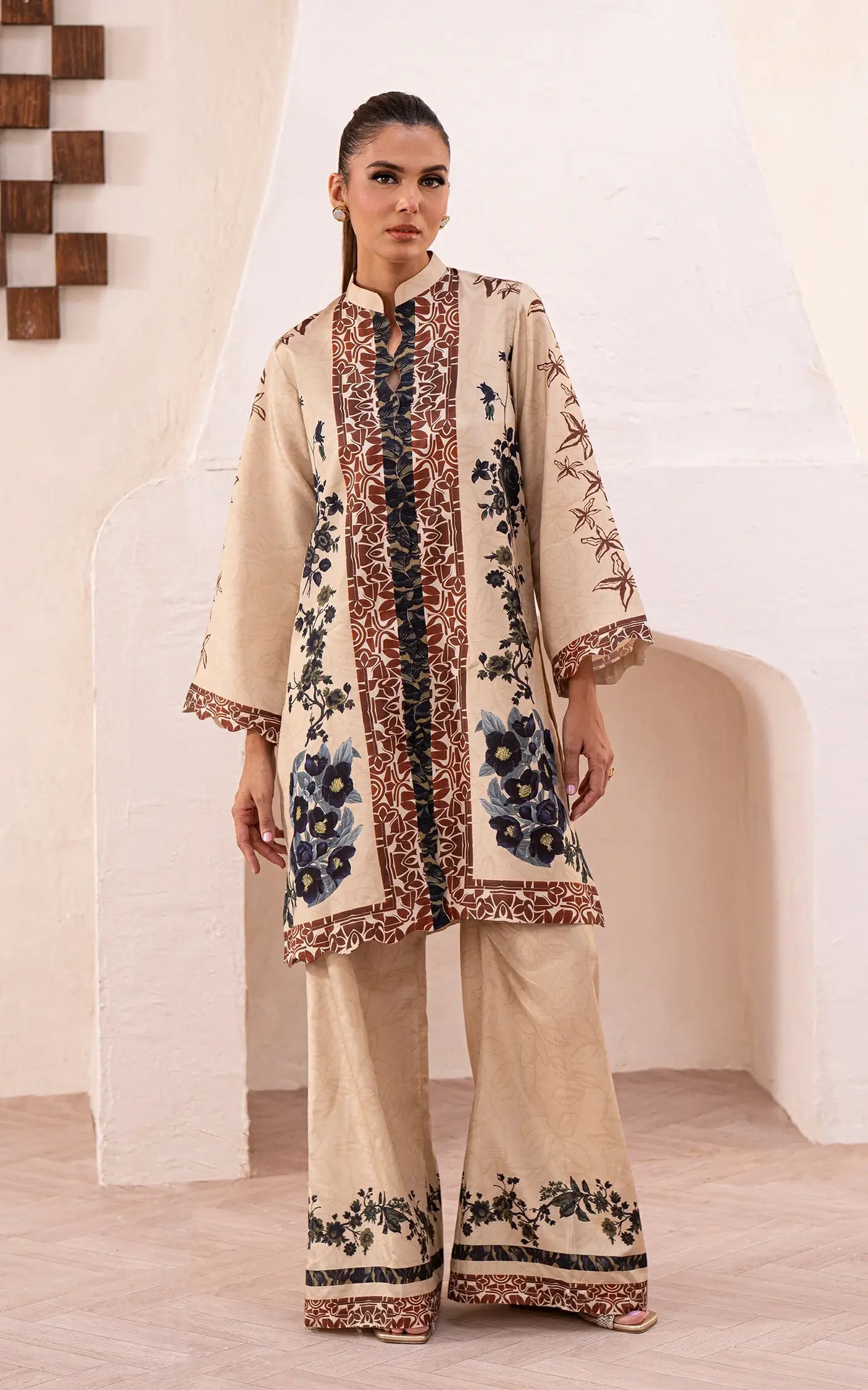 This breezy co-ord set in luxurious PK raw silk blends warm desert tones with deep blue blooms, capturing both grounded elegance and free-spirited charm. The top features a band collar neckline with a short slit, adding a touch of sophistication. Designed for comfort and effortless style, this set offers a relaxed fit and artistic flair for everyday wear.