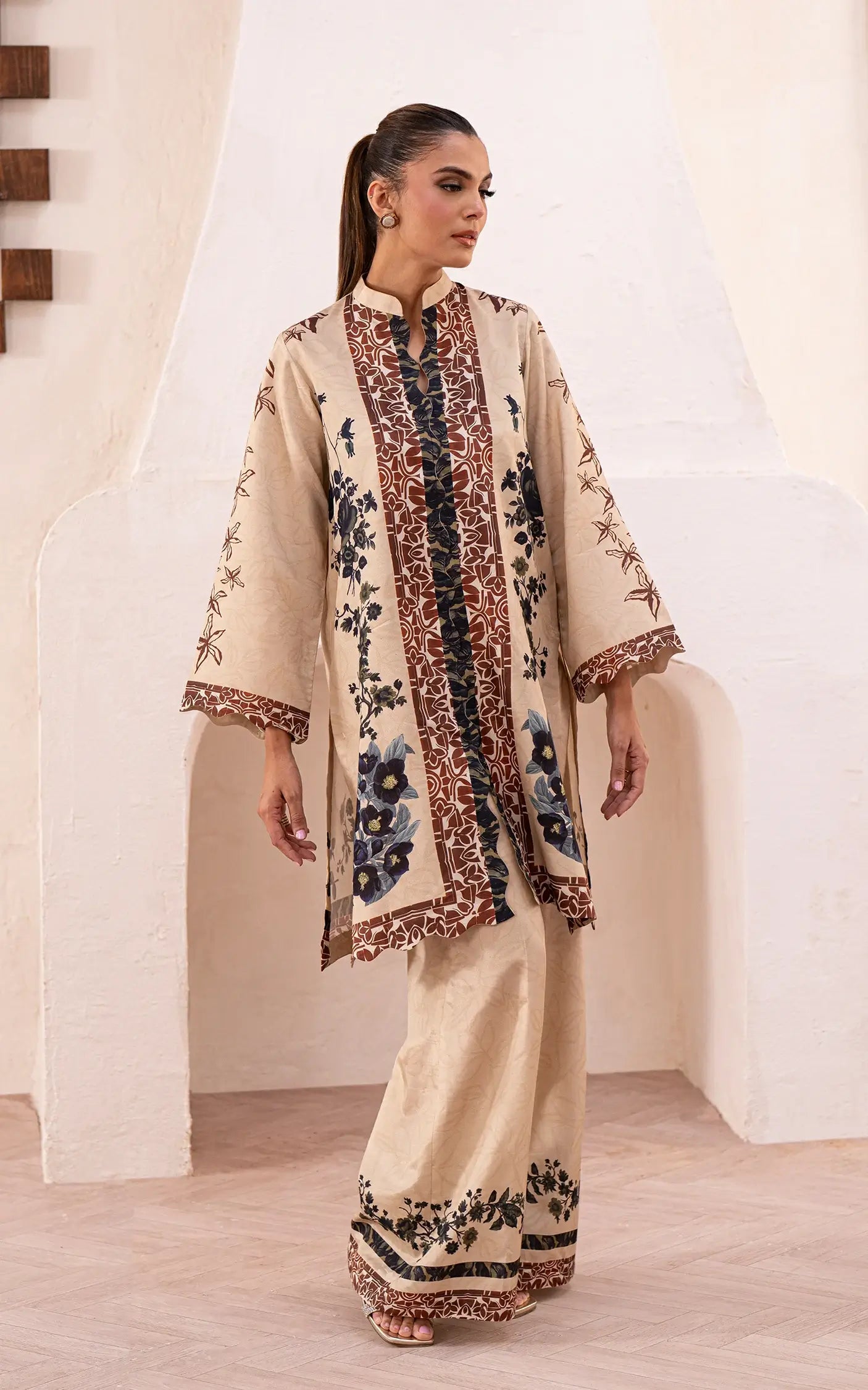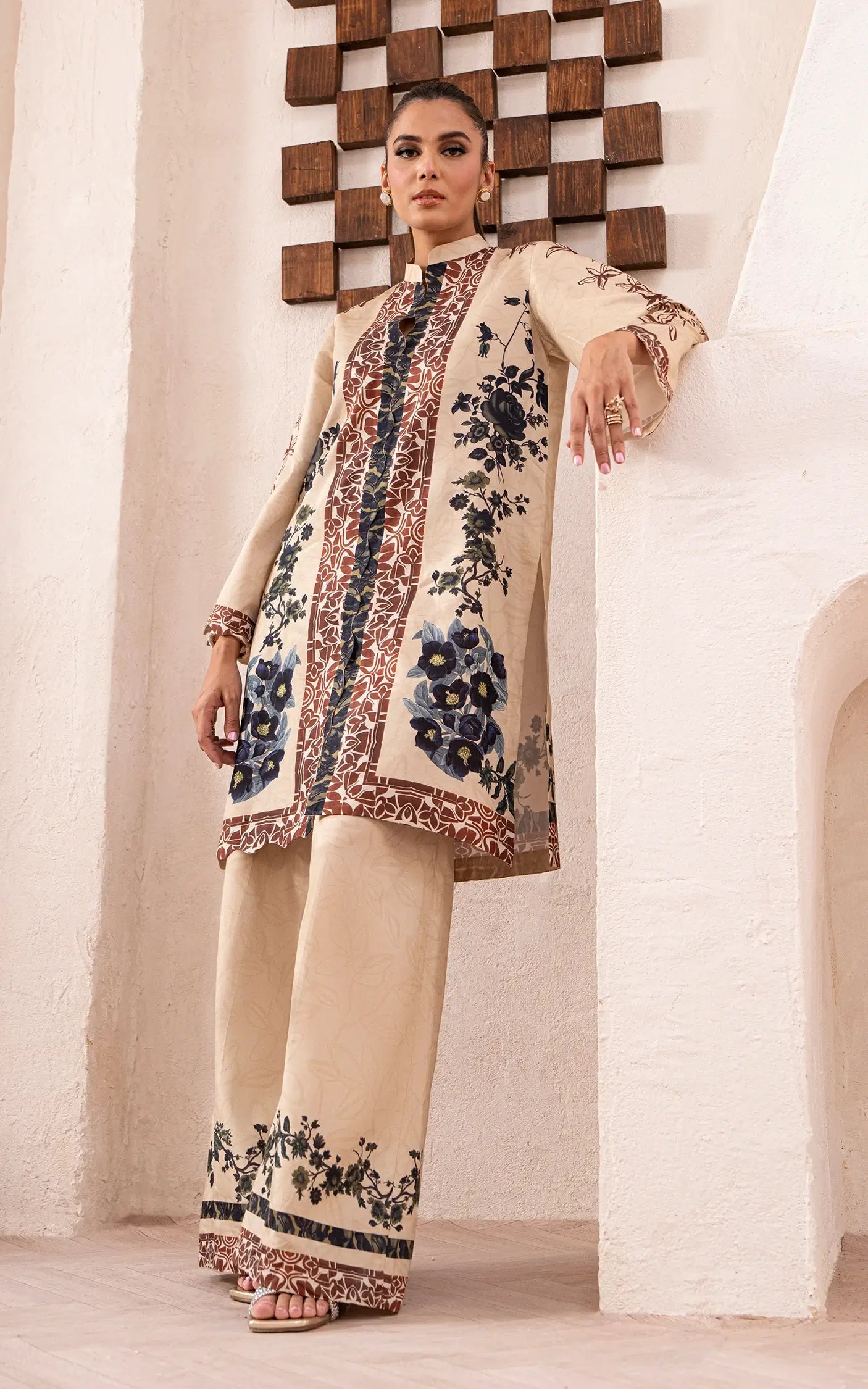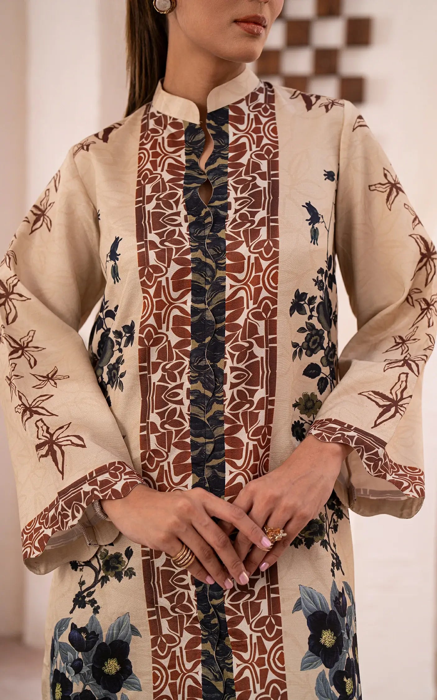 This breezy co-ord set in luxurious PK raw silk blends warm desert tones with deep blue blooms, capturing both grounded elegance and free-spirited charm. The top features a band collar neckline with a short slit, adding a touch of sophistication. Designed for comfort and effortless style, this set offers a relaxed fit and artistic flair for everyday wear.