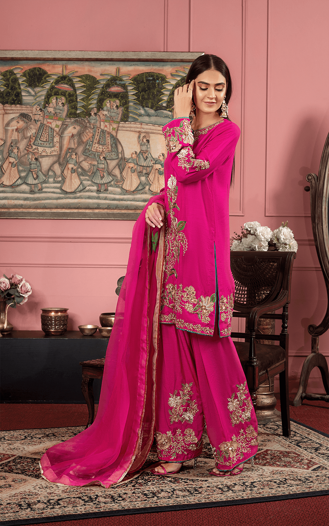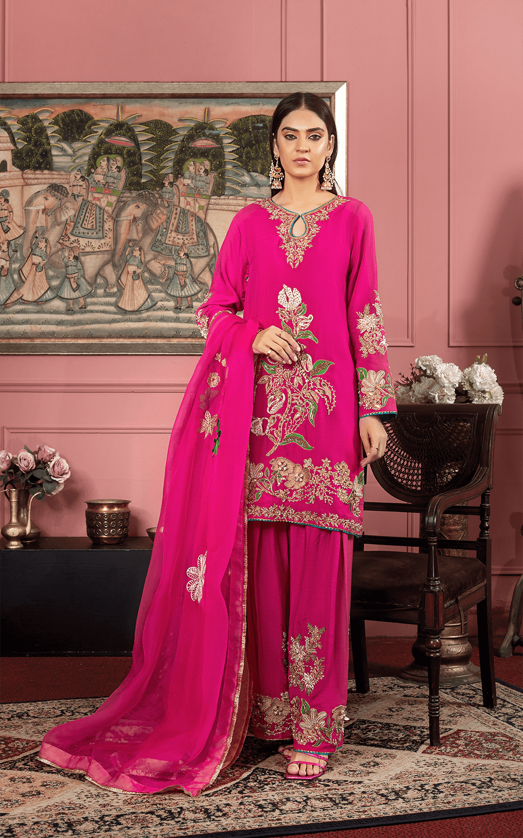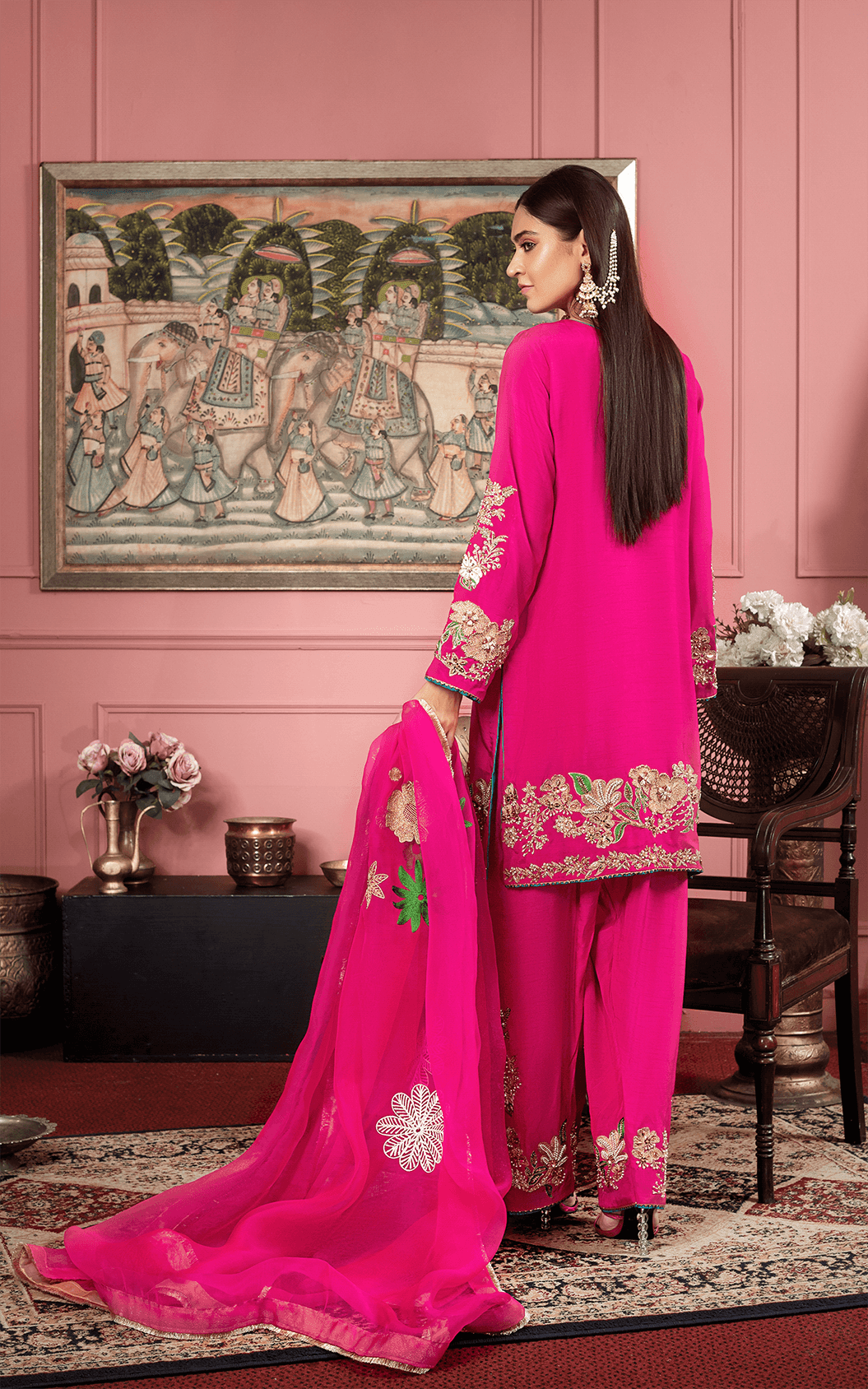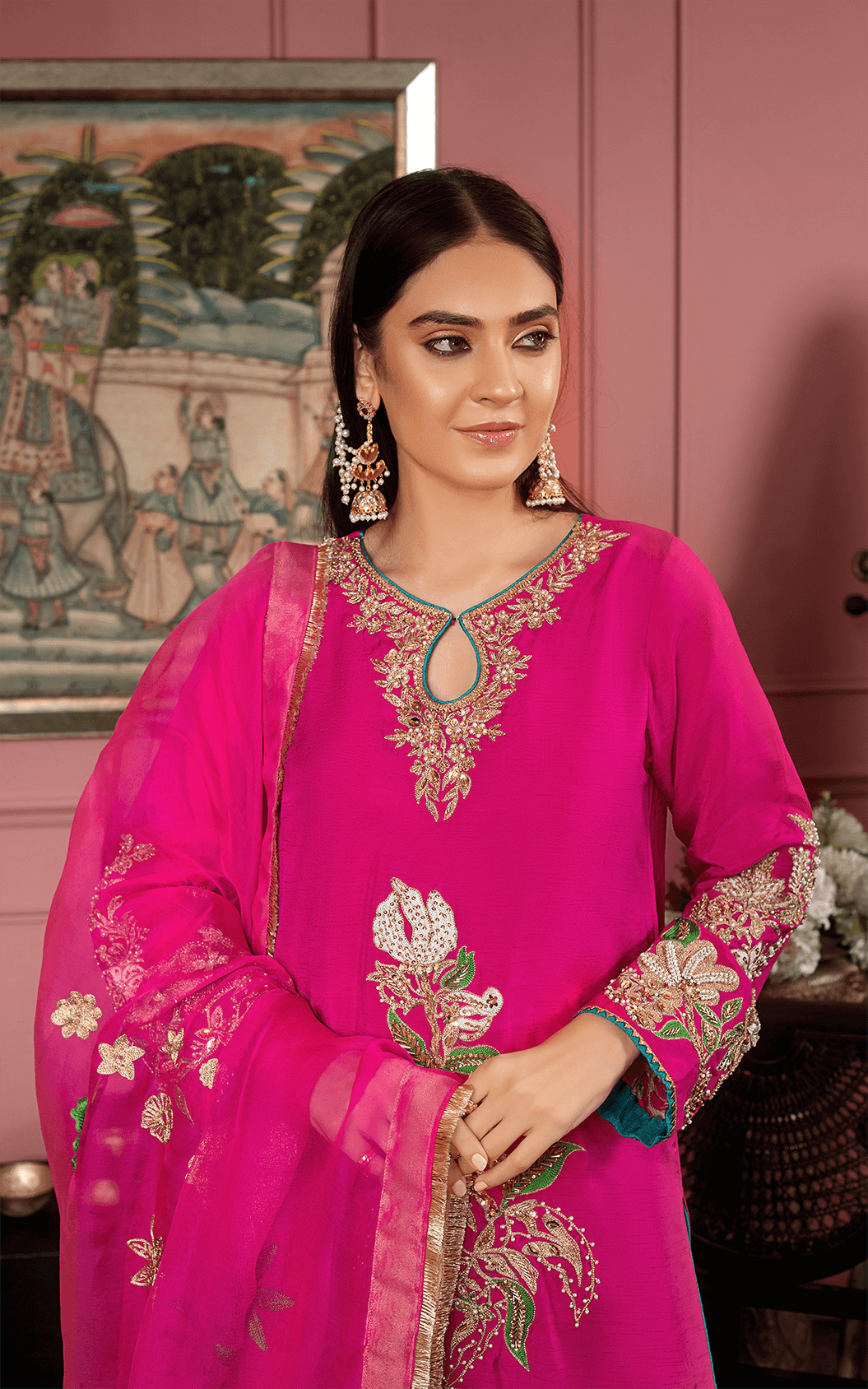 DESCRIPTION: Beautifully crafted from a remarkable glamorous shade of shocking pink, Jhumka features Raw Silk traditional shalwar kameez adorned with heavy handwork embroidery and embellishments. Paired with an enchanting pure organza dupatta with bold embellished motifs all over, giving the perfect traditional vibe.