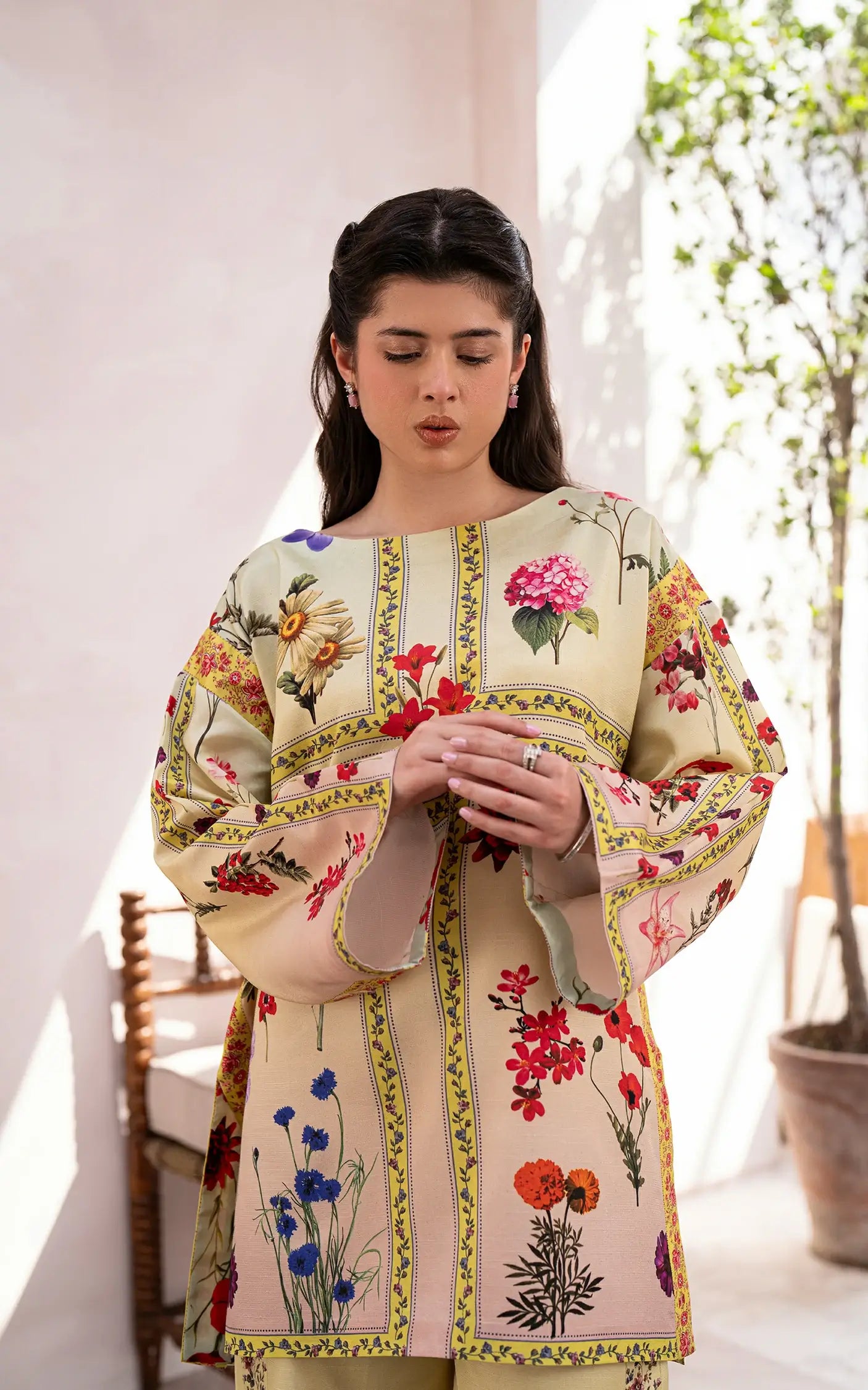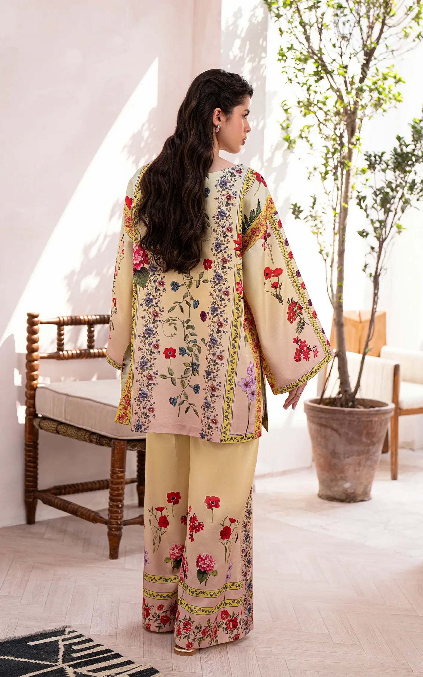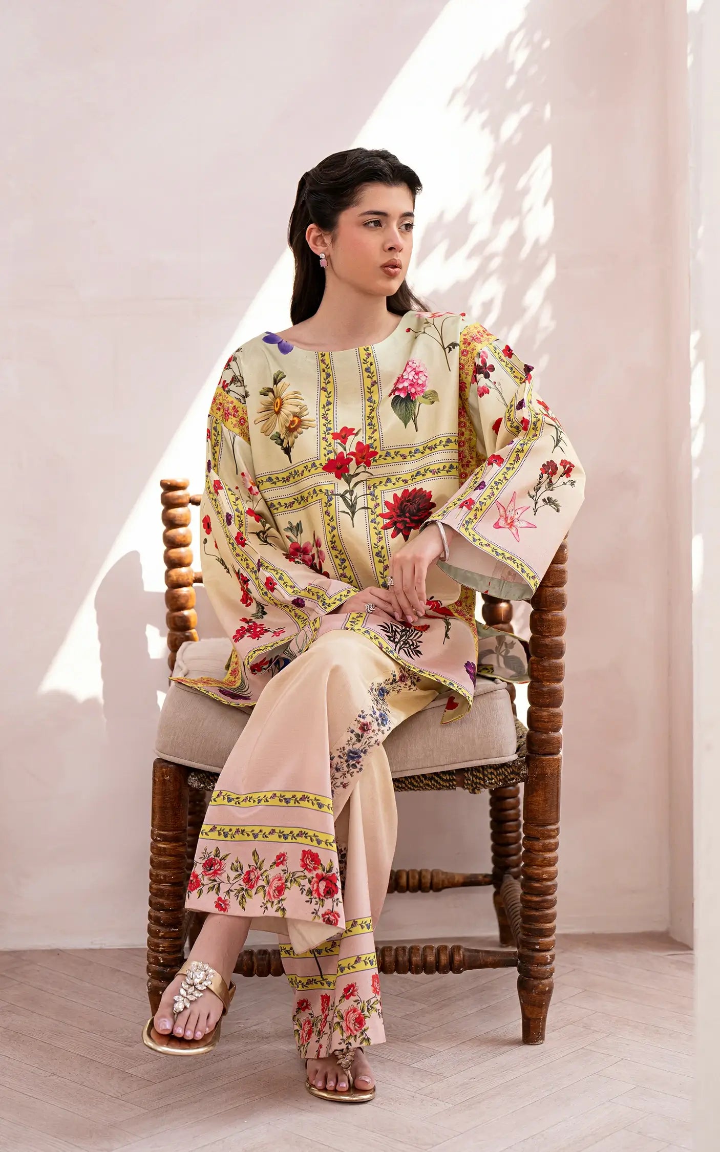 This stunning coord set in luxurious PK raw silk features rich, digitally printed florals that bring timeless elegance to life. The top is designed with a boat-shaped neckline, paired perfectly with matching bottoms for a harmonious look. Ideal for those seeking effortless sophistication, this set offers a flattering silhouette and a perfect balance of color, texture, and print for everyday elegance.