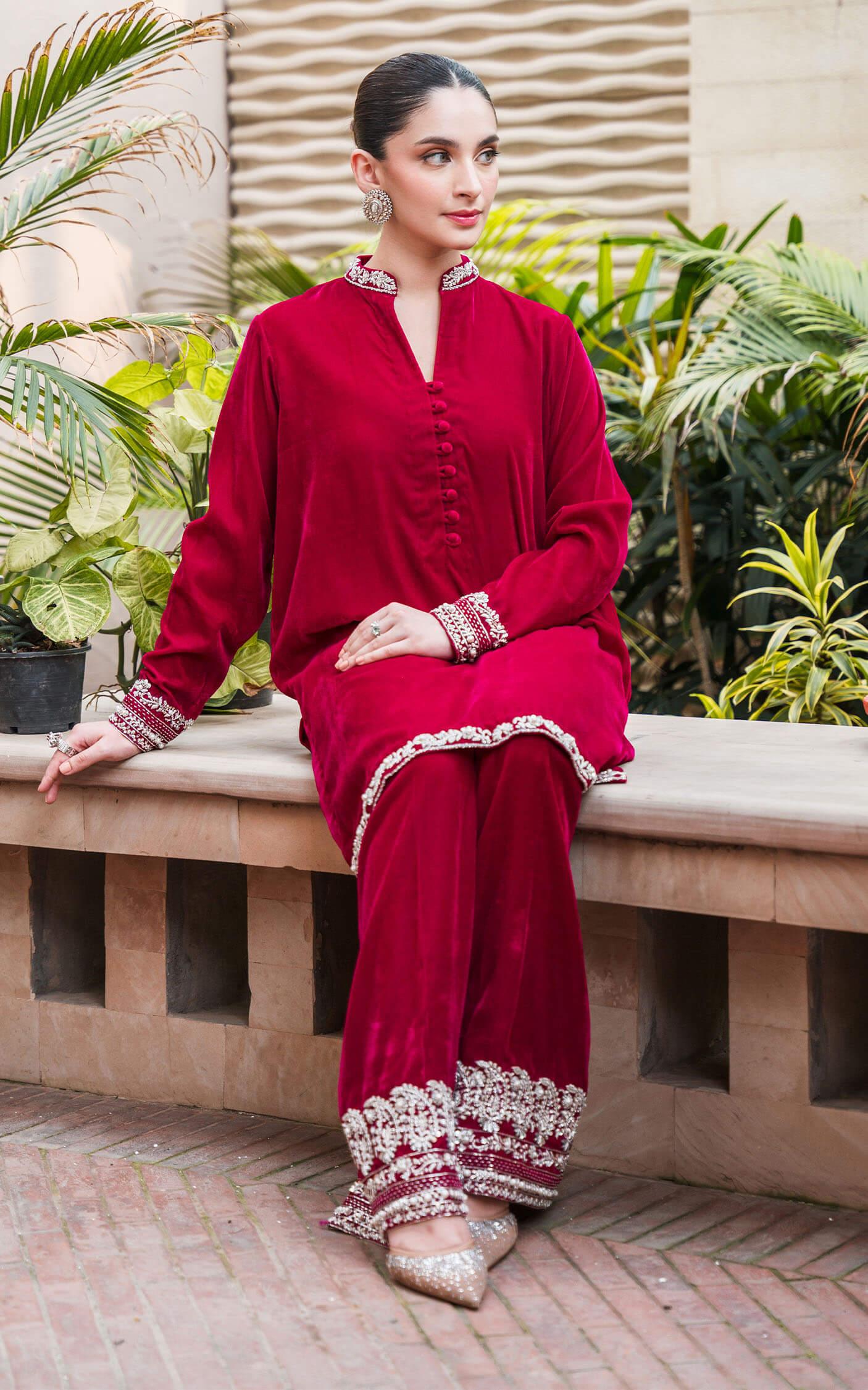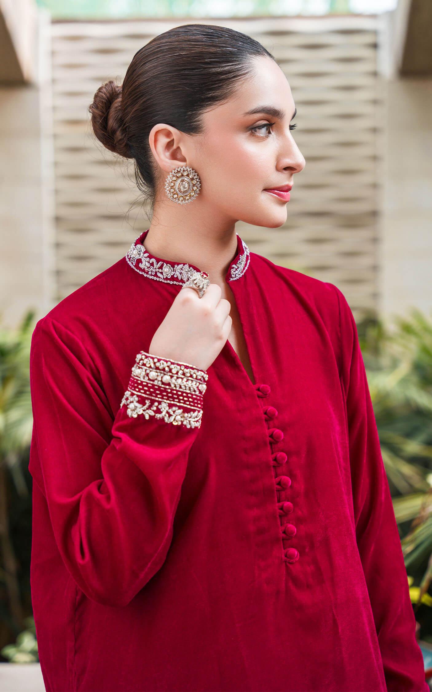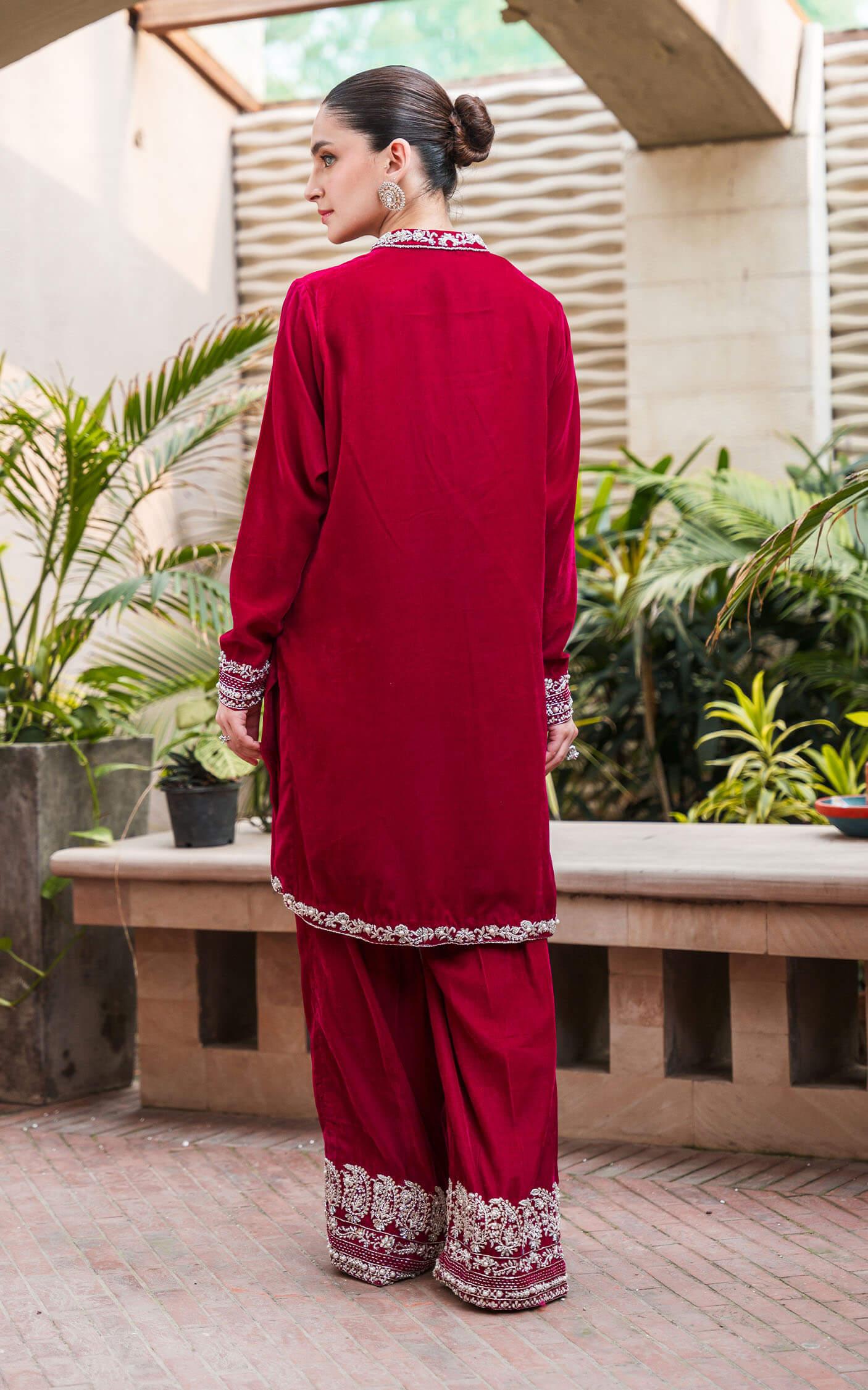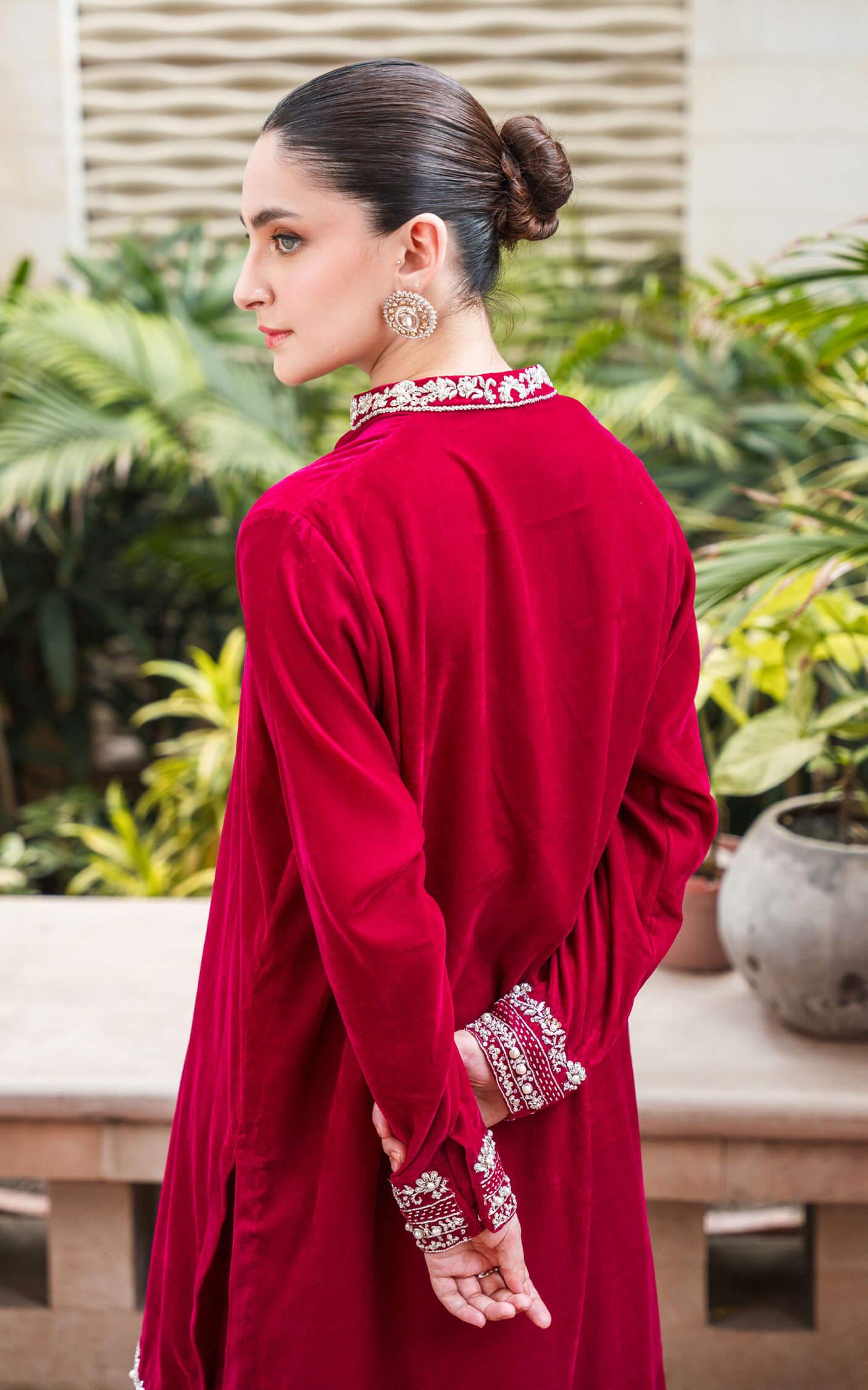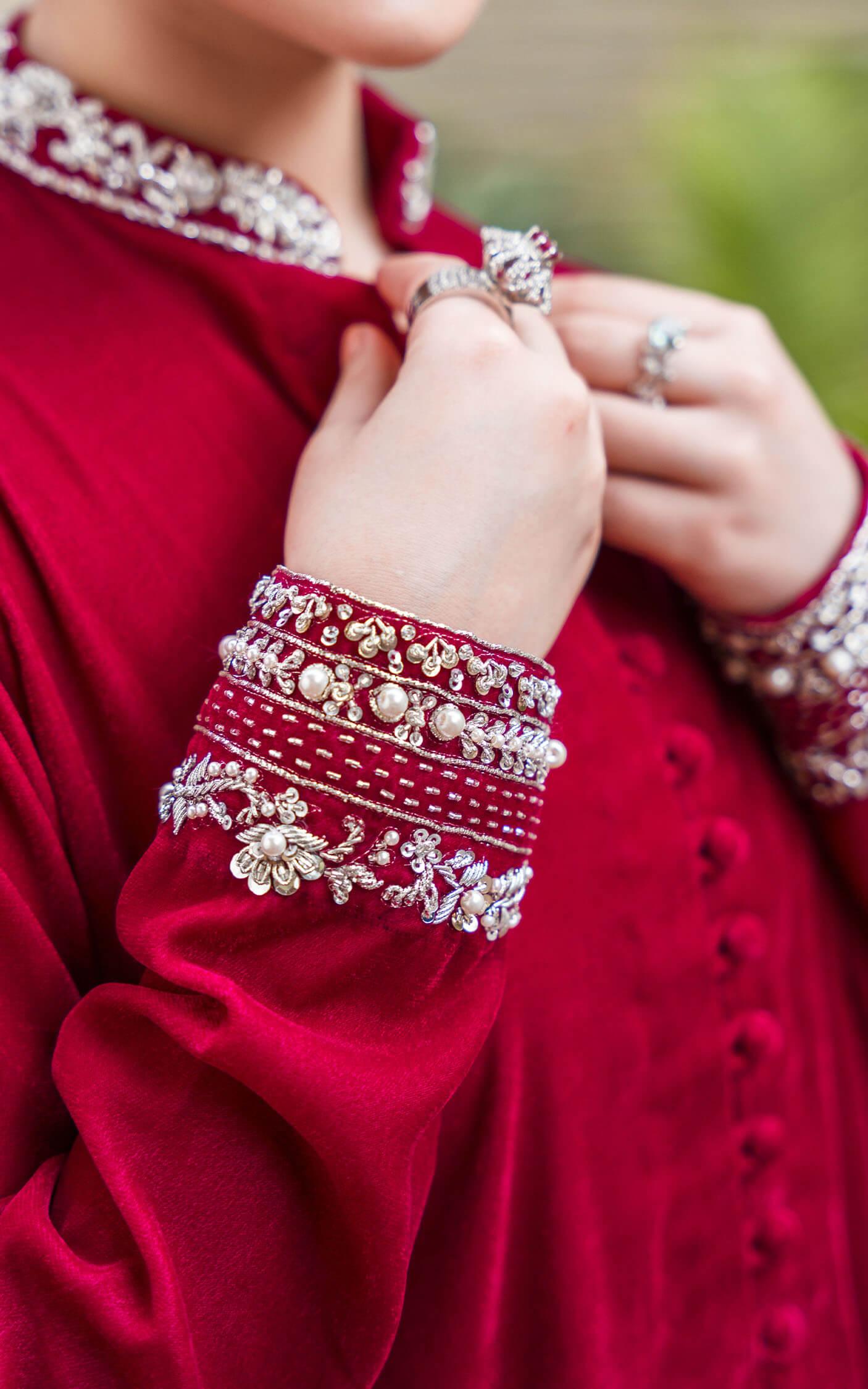 Luxury Ruby Red lush velvet with round button details and beautiful silver zardozi handwork