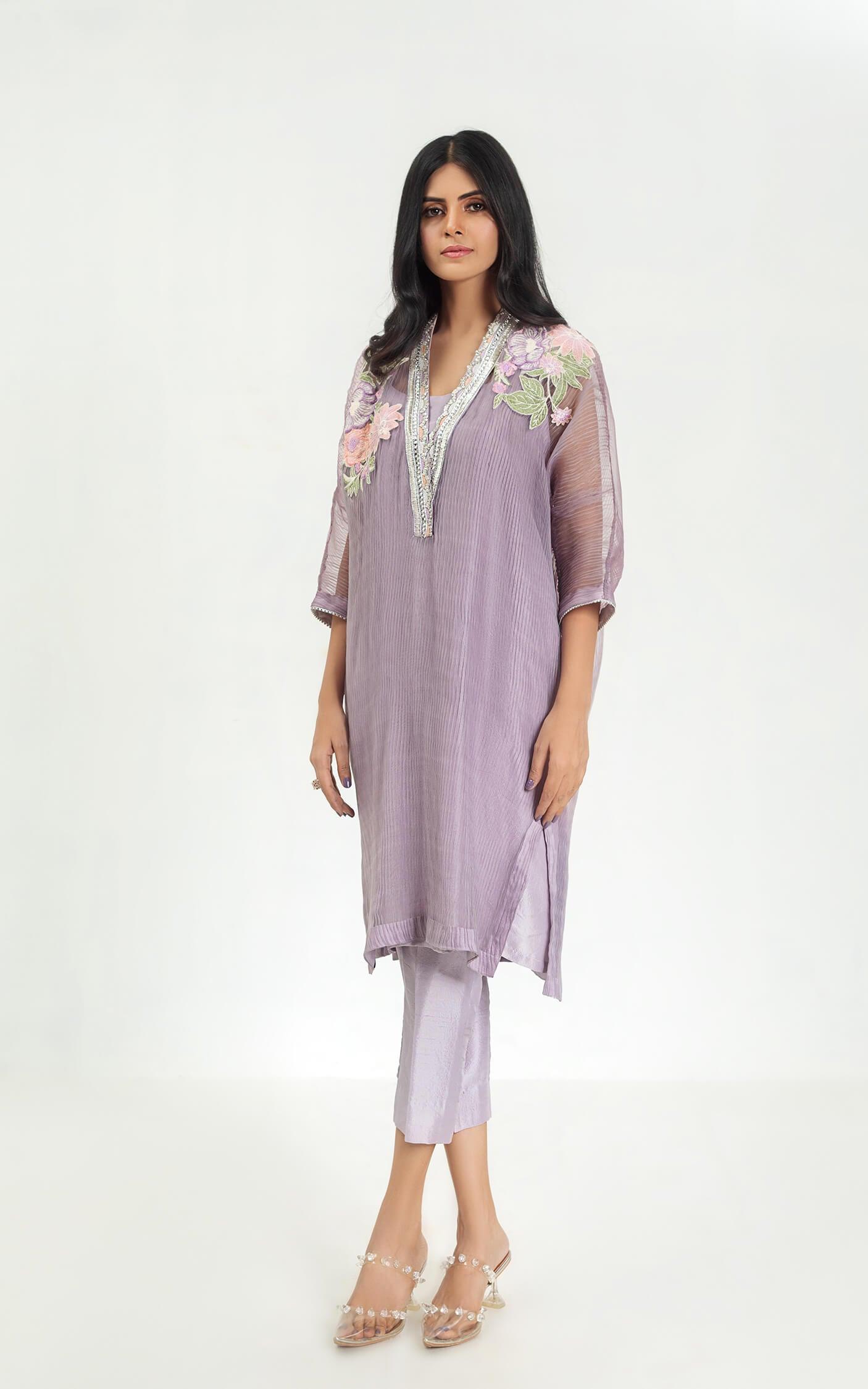 - Organza Pleated Shirt, Raw Silk Trouser, Raw Silk Inner.