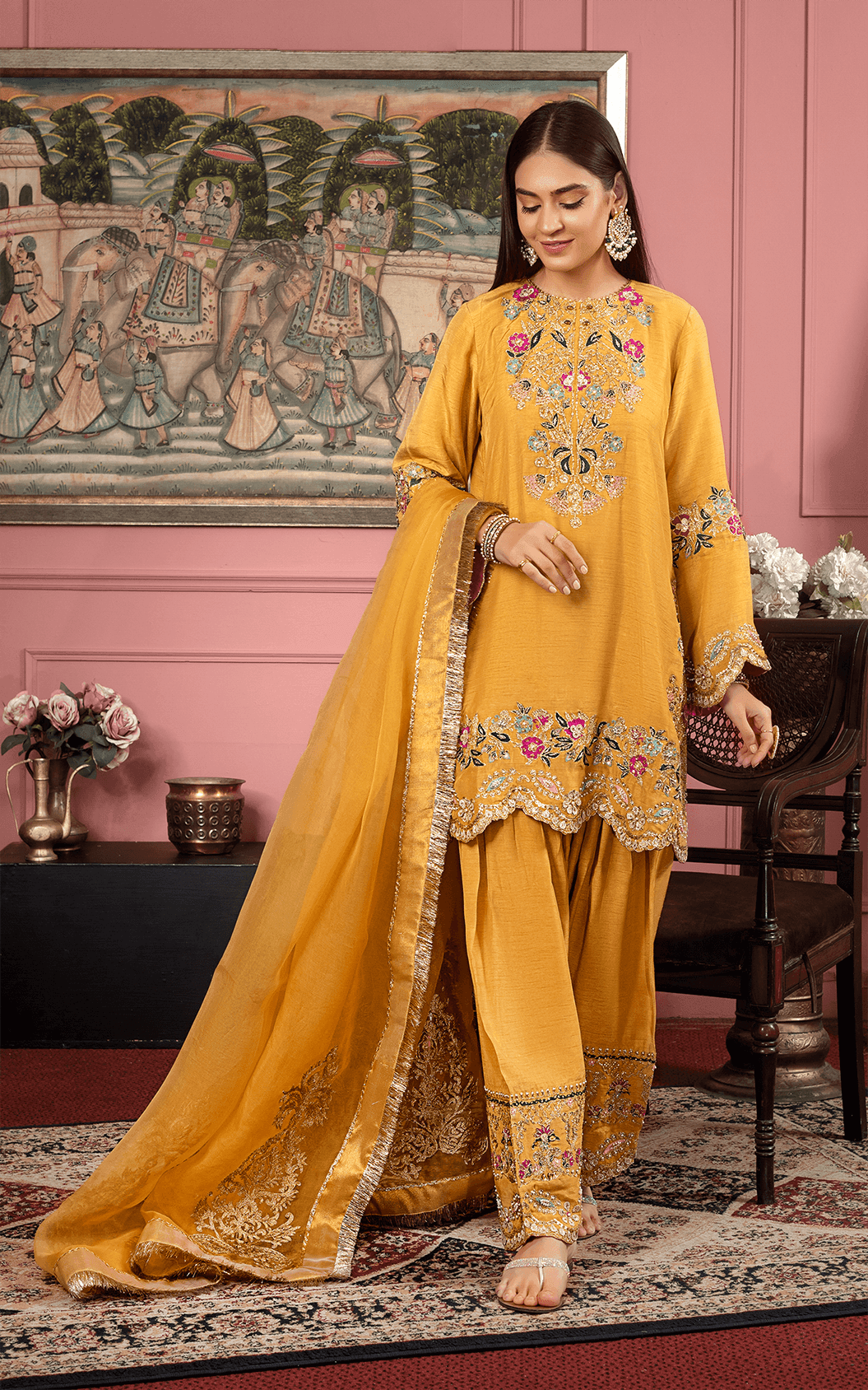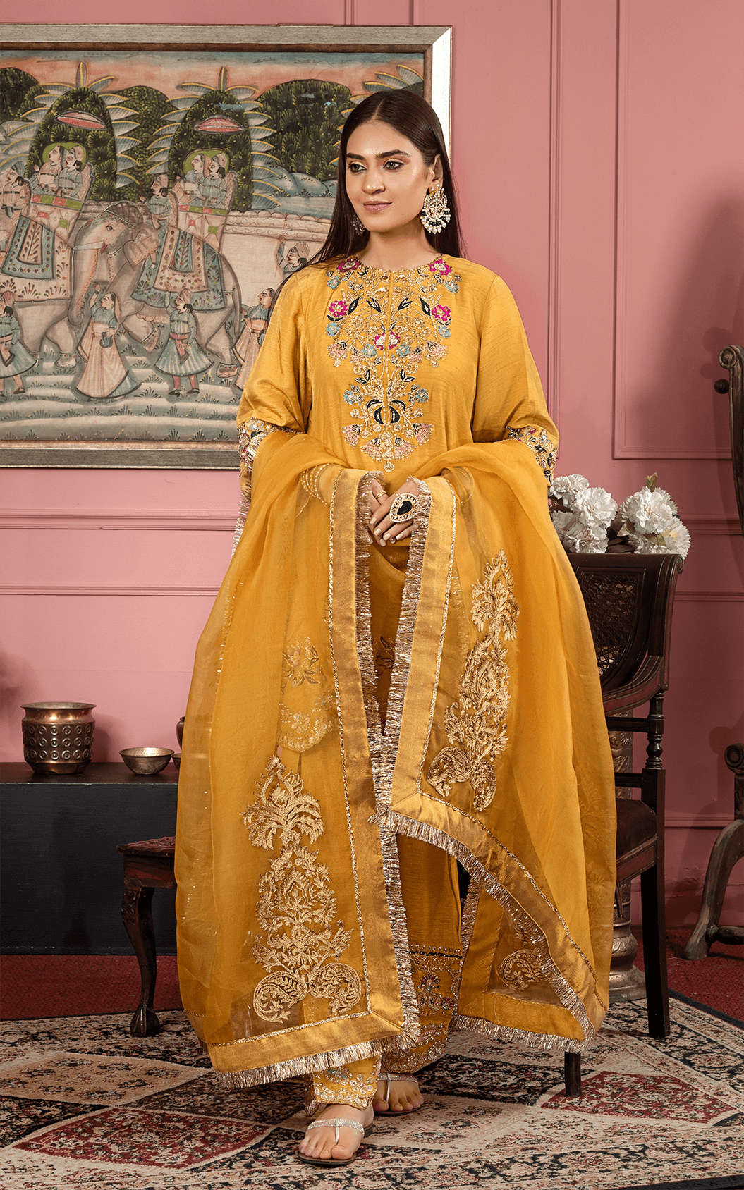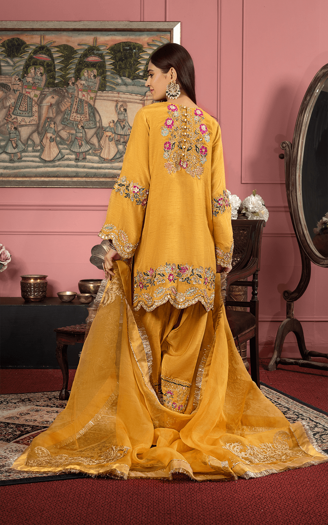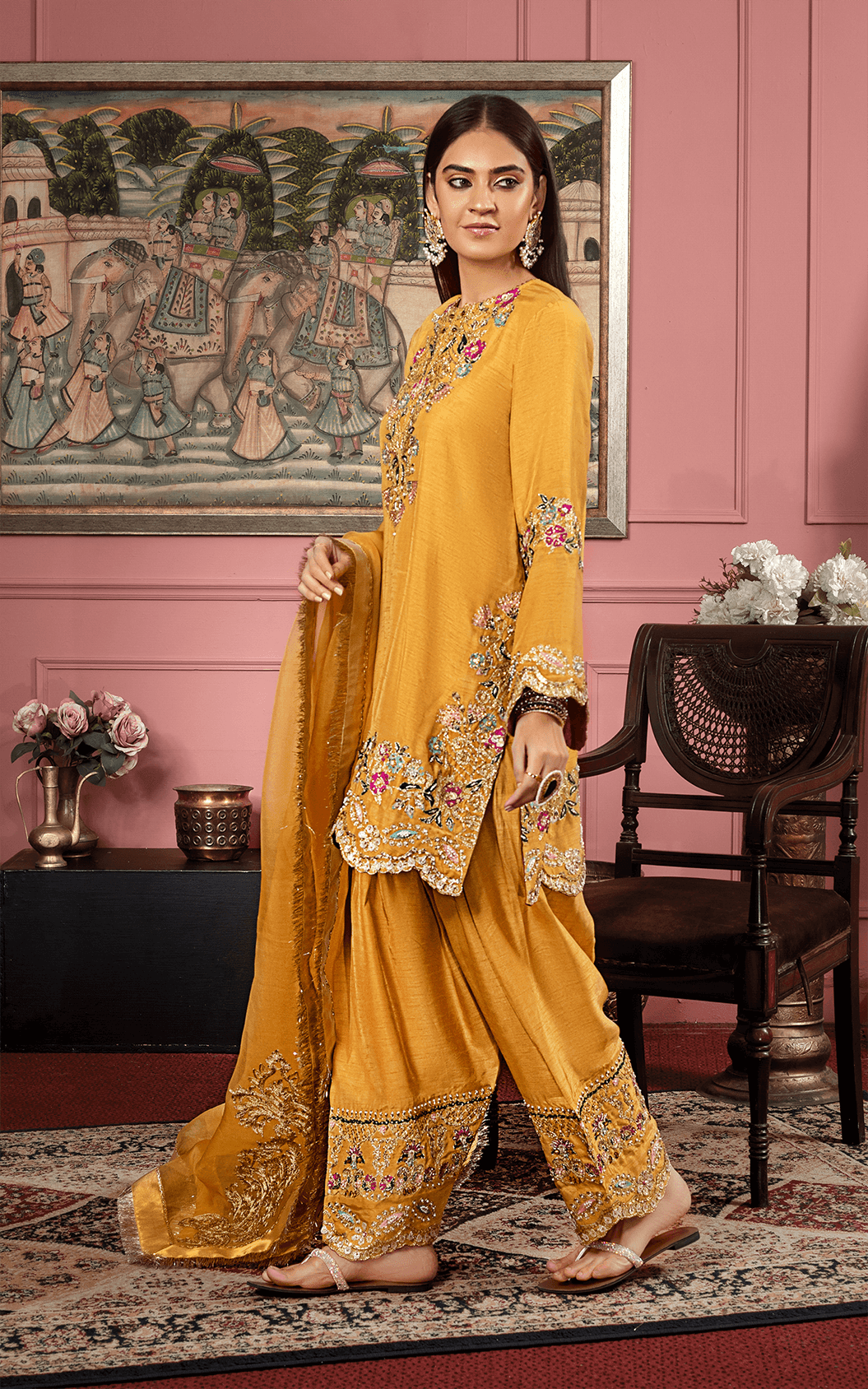 DESCRIPTION: Nauratan features a delightful silhouette, a striking yellow raw silk shalwar kameez while displaying stunning hand embellishments and aari embroidery artistically on neckline, sleeves, shirt & shalwar hem. The desi look is completed with pure organza dupatta with detailed embroidered motifs, kiran and tissue finishing.