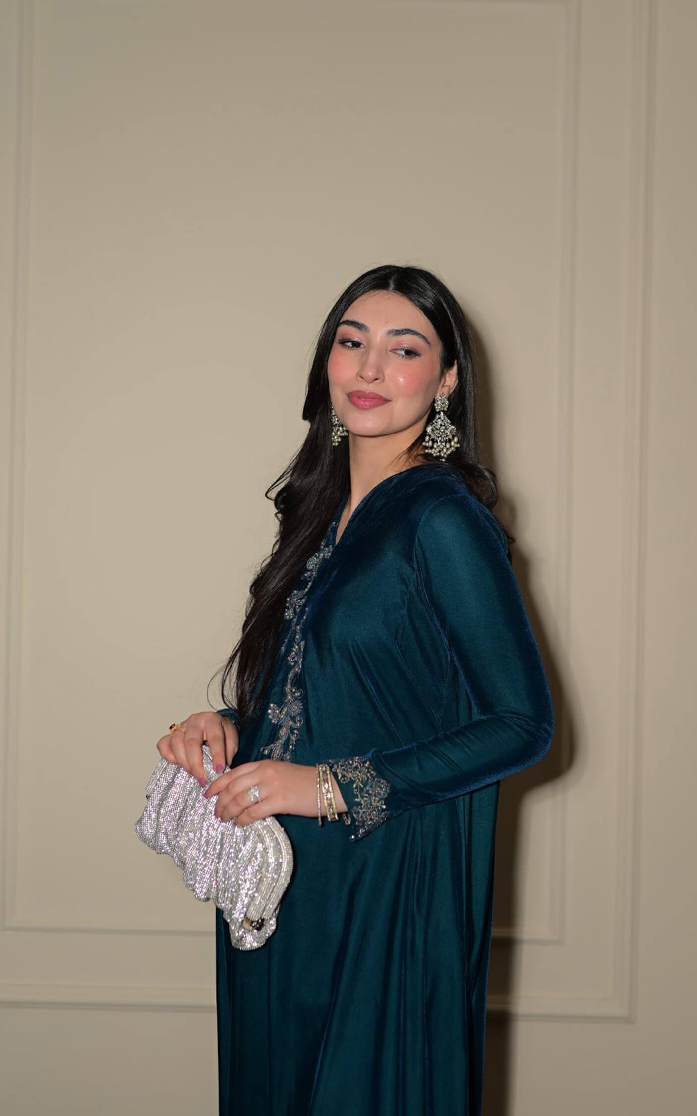 The long-cut velvet silhouette drapes beautifully, offering a graceful, flattering fit. The elegance is perfected by the intricate embroidery and dazzling stone embellishments adorning the neckline, drawing the eye and adding a touch of unparalleled glamour. This kaftan is the ultimate statement of sophisticated winter style.