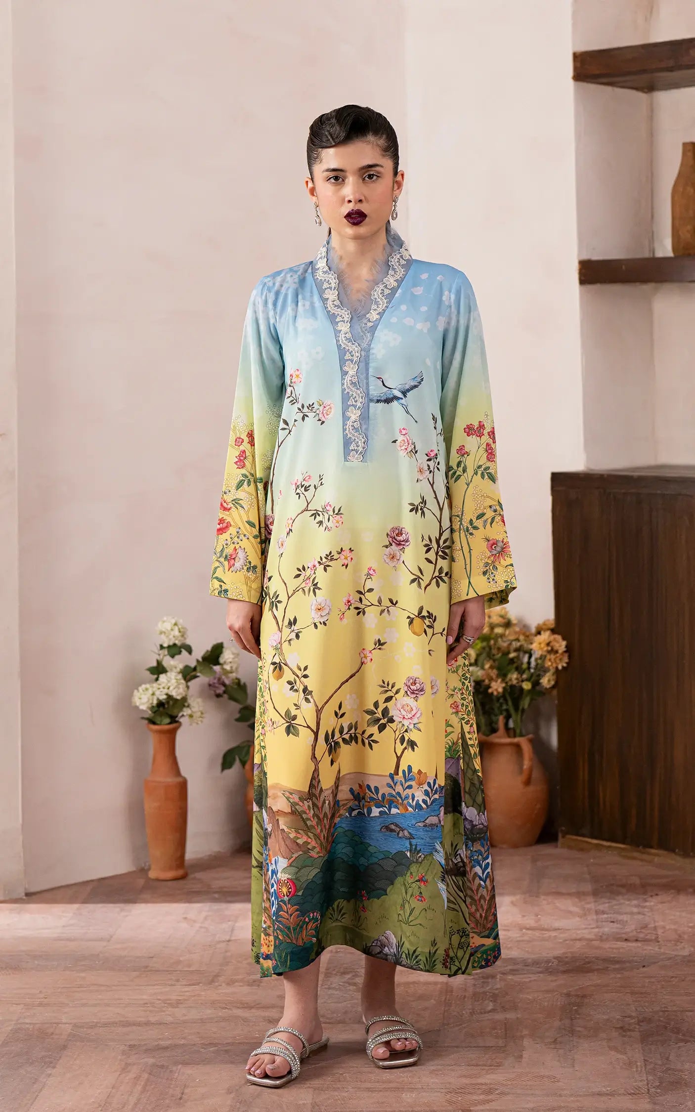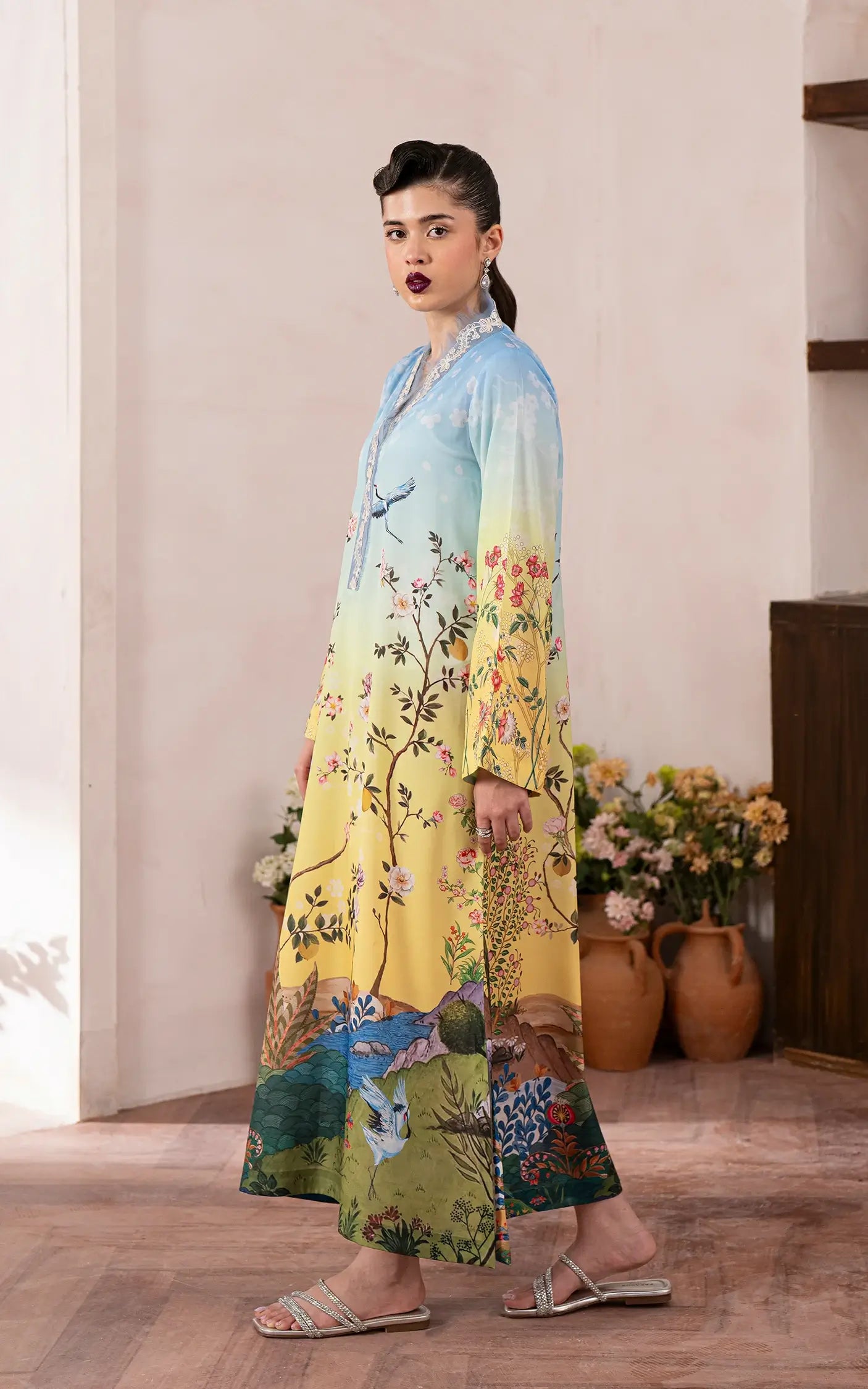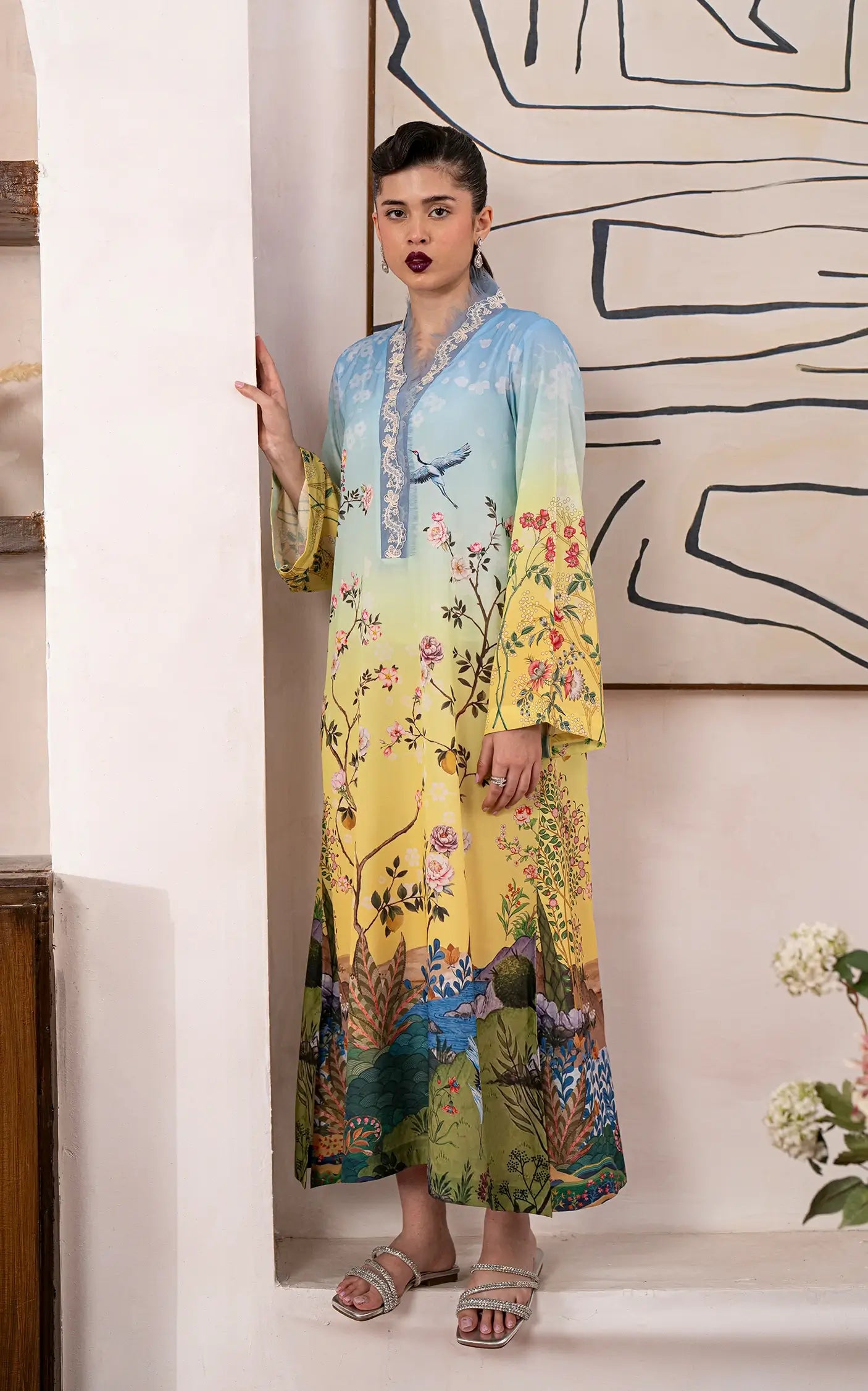 A dreamy blend of soft florals and scenic hues comes to life on this beautifully crafted kaftan, made from luxurious grip fabric for both comfort and style. The V-neckline is elevated with an intricately embroidered organza border, adding a delicate touch of refinement to its ethereal charm. A perfect balance of sophistication and ease.