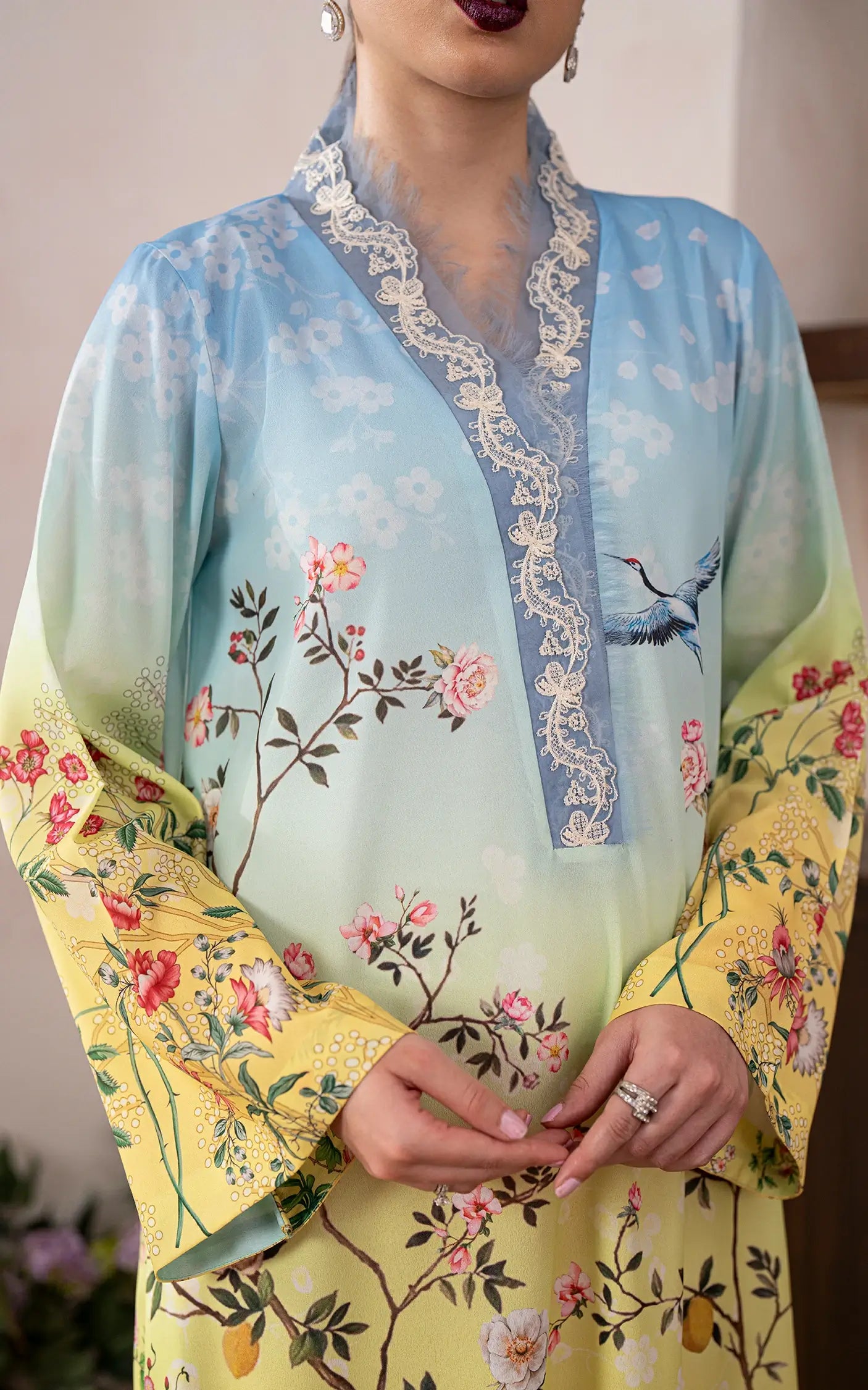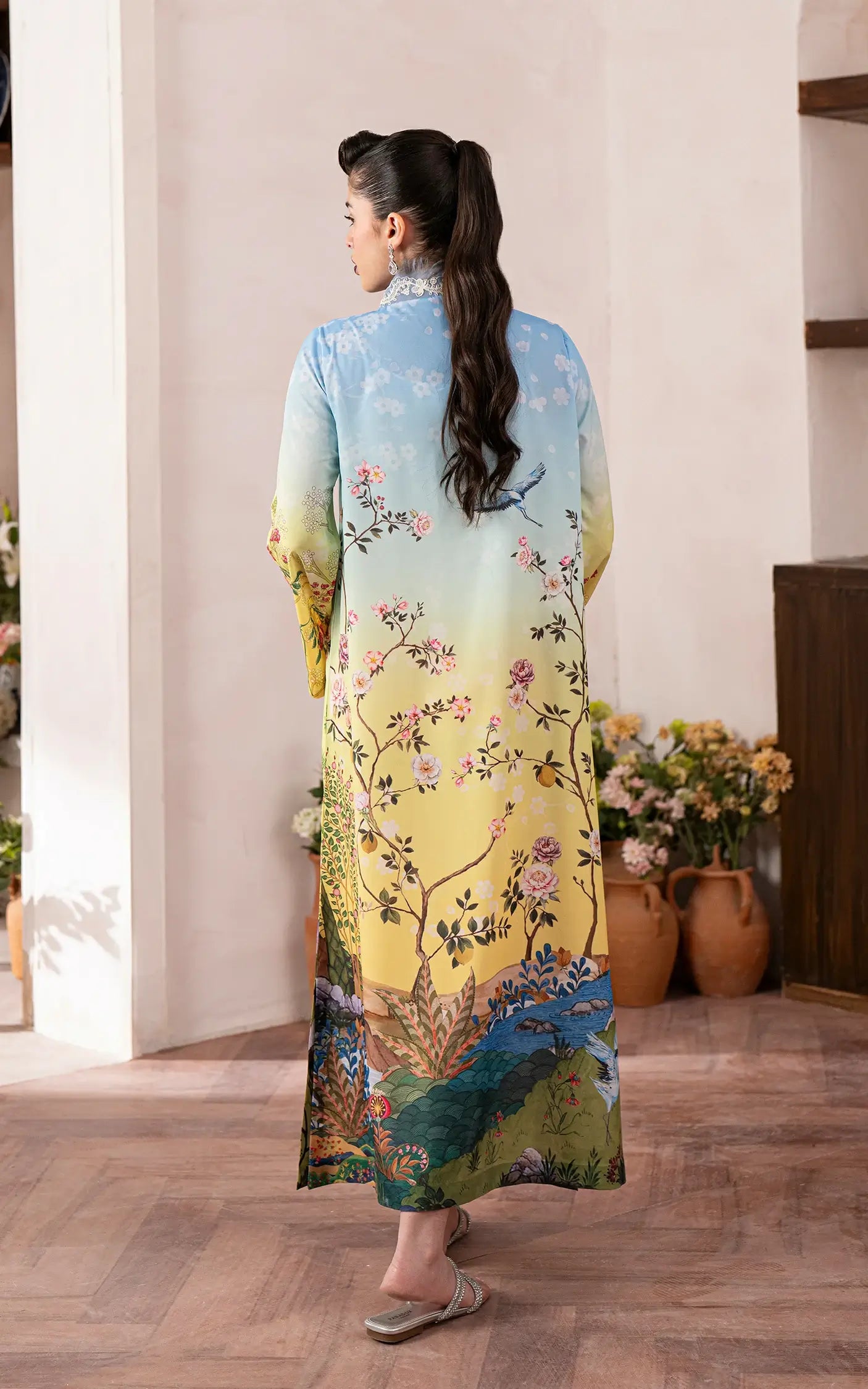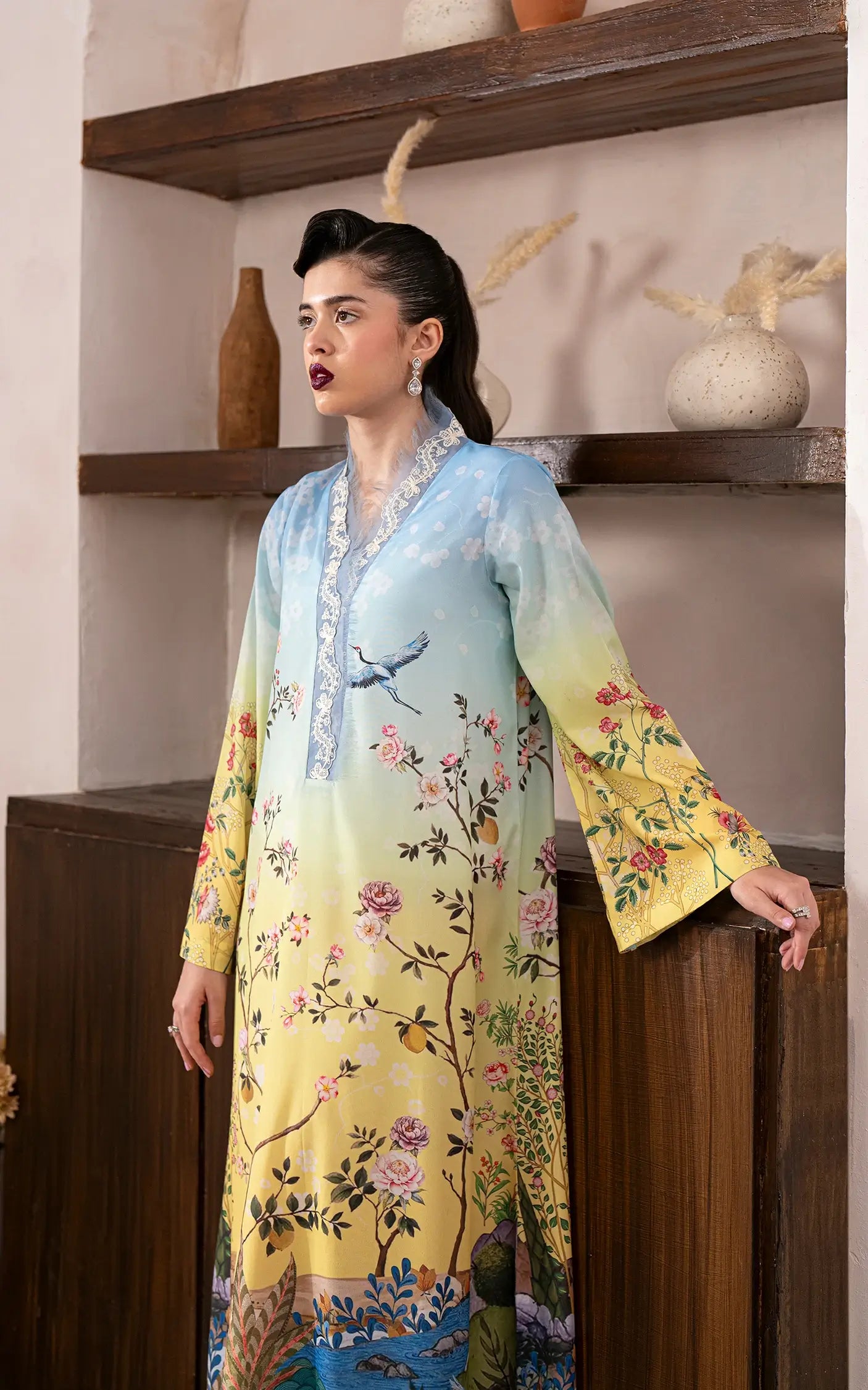 A dreamy blend of soft florals and scenic hues comes to life on this beautifully crafted kaftan, made from luxurious grip fabric for both comfort and style. The V-neckline is elevated with an intricately embroidered organza border, adding a delicate touch of refinement to its ethereal charm. A perfect balance of sophistication and ease.