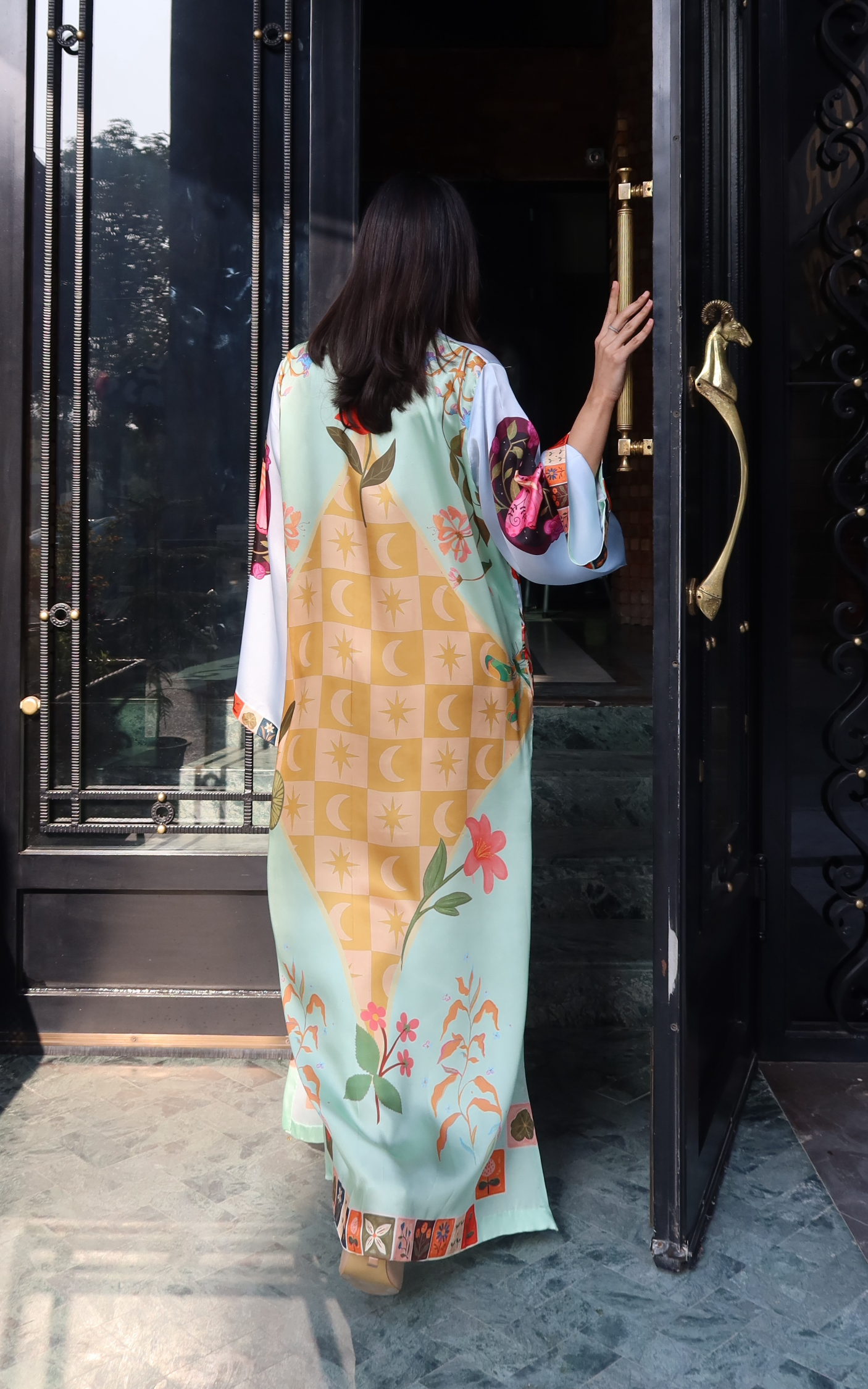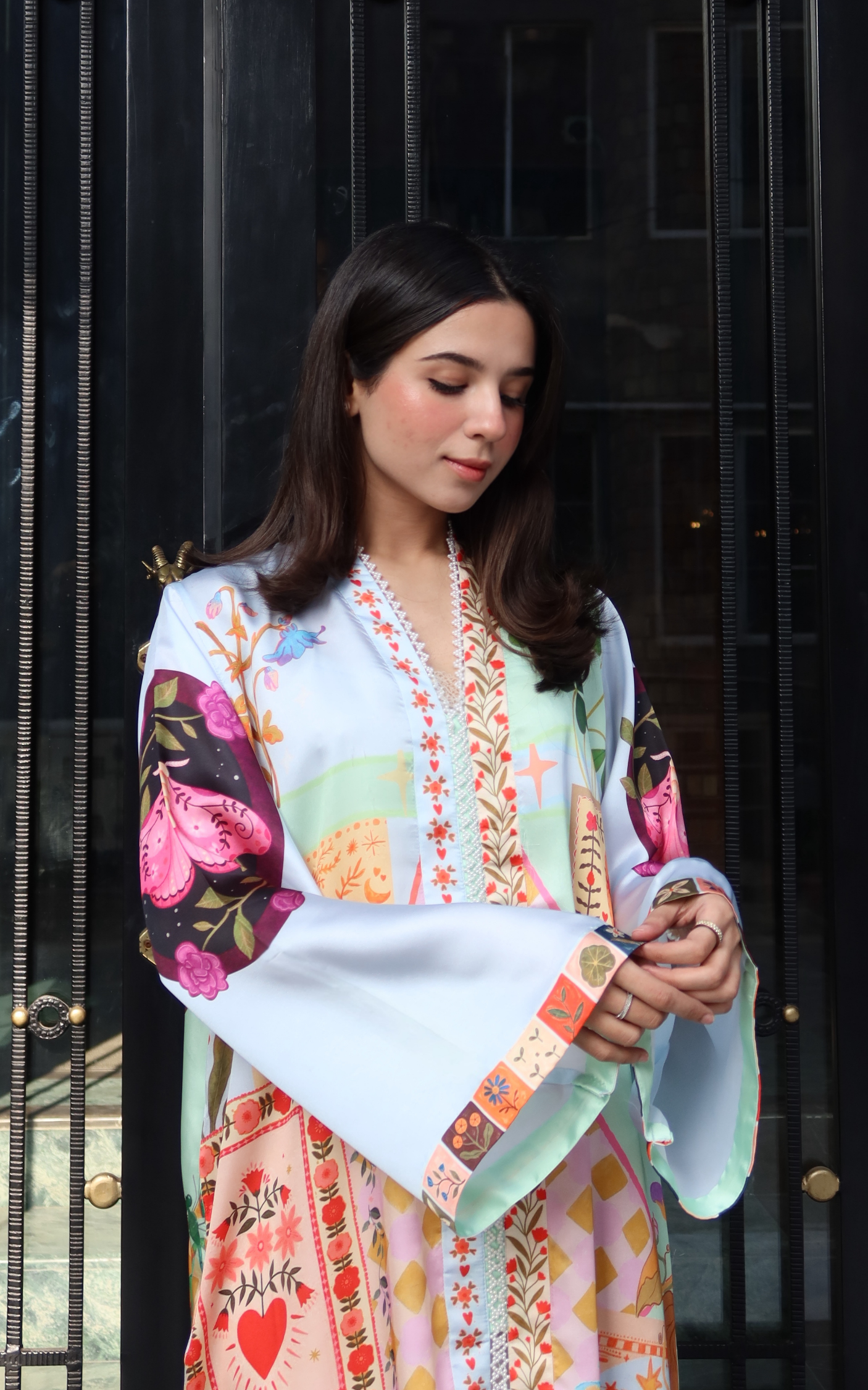 Elevate your evening wardrobe with this floor-length Kaftan, rendered in luxurious Shamooze Silk. Featuring a vibrant botanical print with playful heart motifs and intricate floral borders, the design offers a perfect blend of whimsical art and high fashion. Its relaxed, flowy fit and straight silhouette create a fluid cut that drapes effortlessly, while wide flared sleeves and a delicate embroidered neckline add a touch of refined drama.