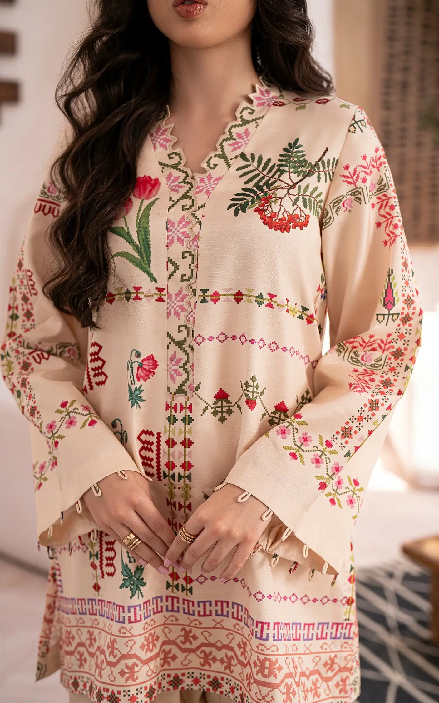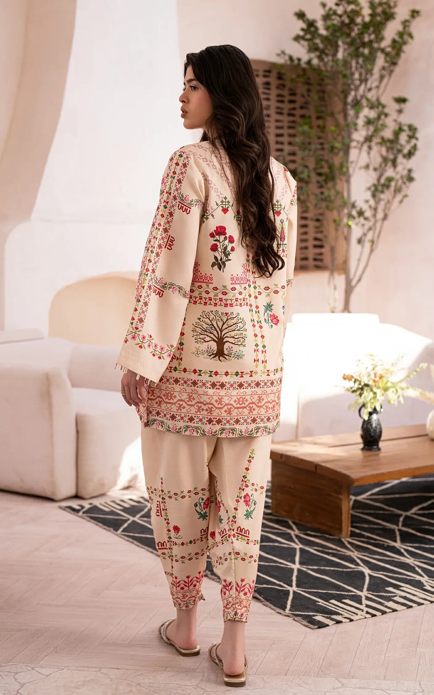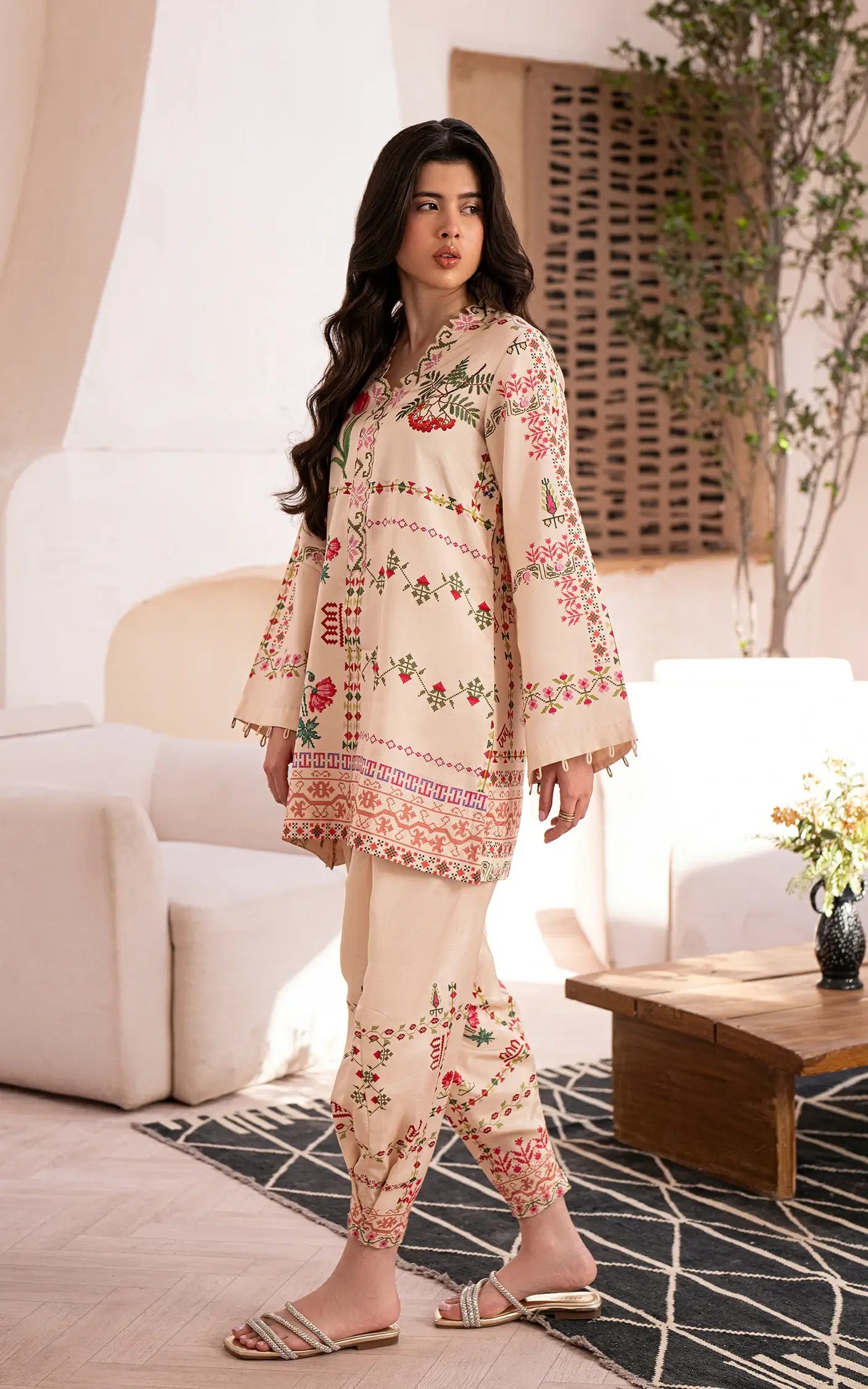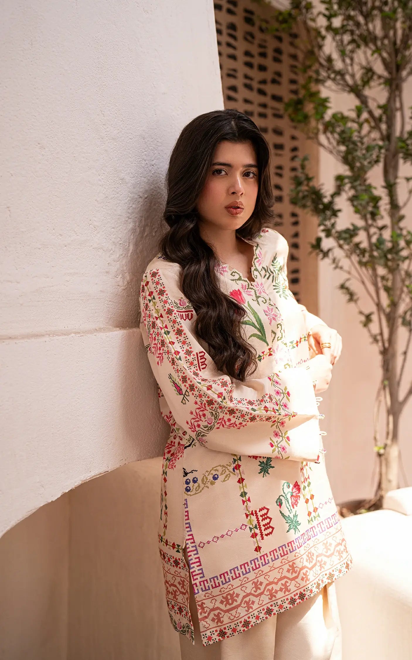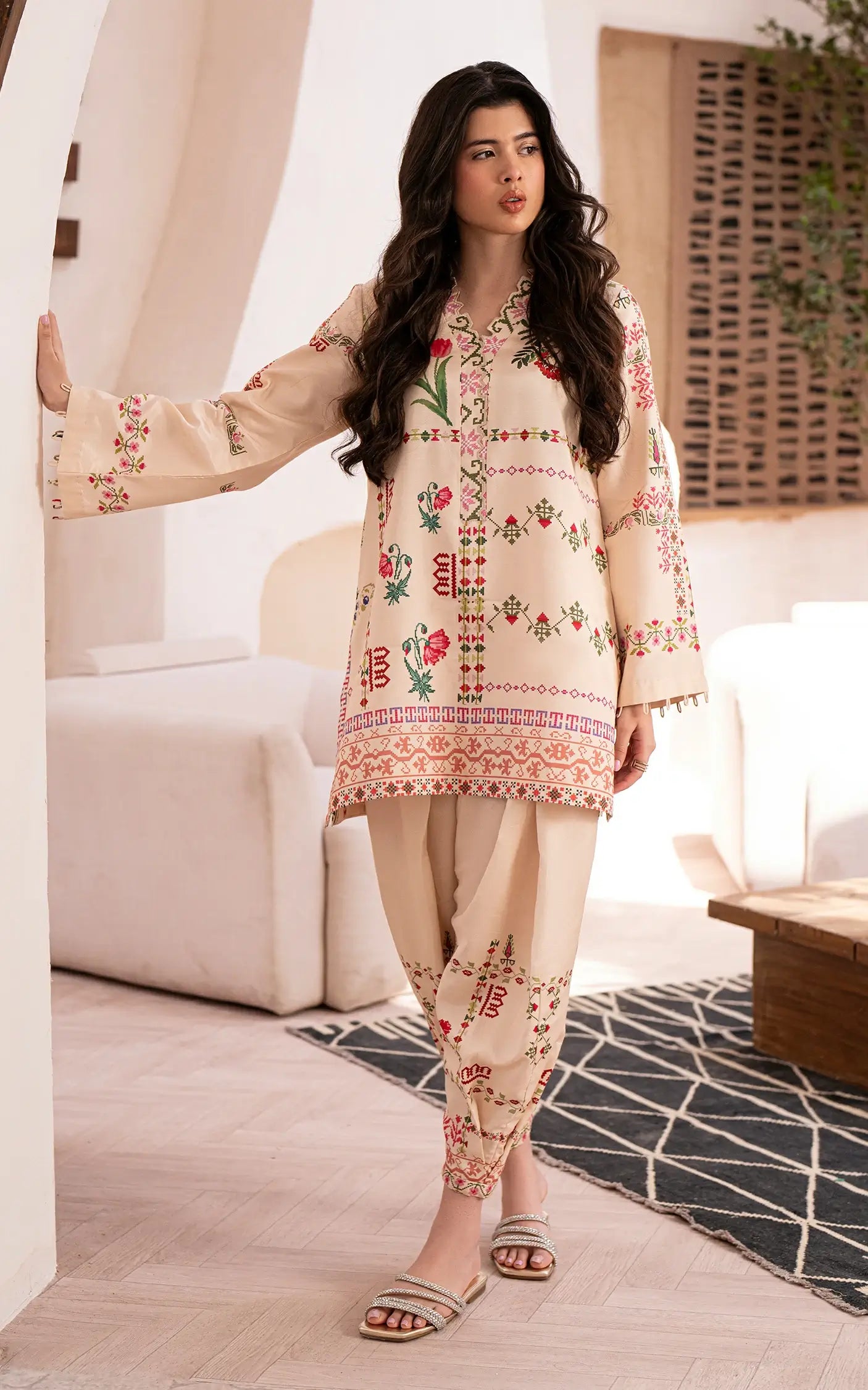 This set-in luxurious PK raw silk features a band collar with a center slit, paired with a classic shalwar in a loose, voluminous cut. The design offers a clean, contemporary look with effortless comfort and sophistication.