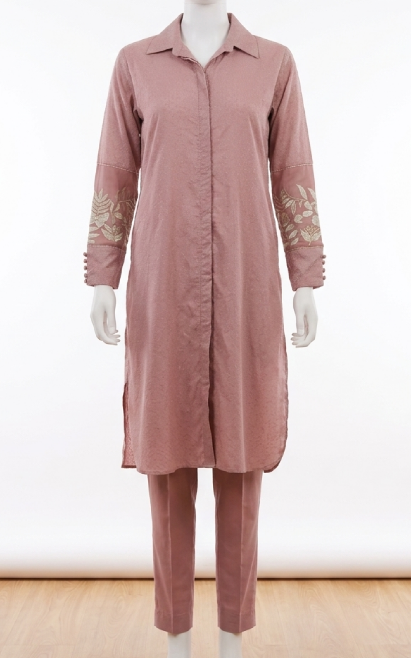 Embrace understated elegance with this sophisticated 2-piece ensemble, a perfect staple for your seasonal transition. The shirt is meticulously tailored from premium dobby lawn, a fabric prized for its unique textured weave and breathable comfort in warmer climates. Rendered in a soft, dusty rose hue, the long-length shirt features a classic button-down collar and refined button detailing on the cuffs.