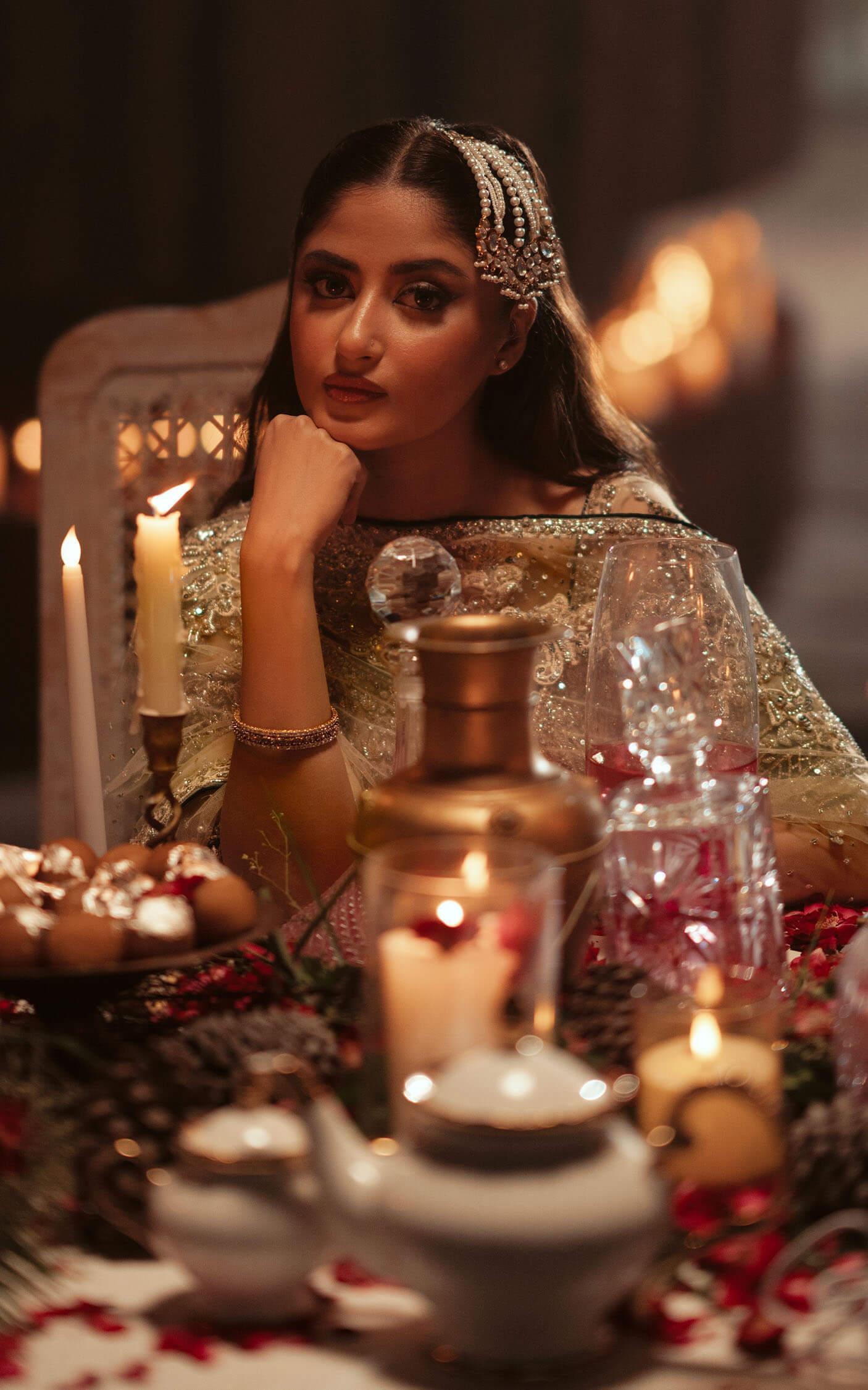 Fully flaired off white net lehnga tissue lining and heavy overall embellishment in silver and gold beading with sap green piping.